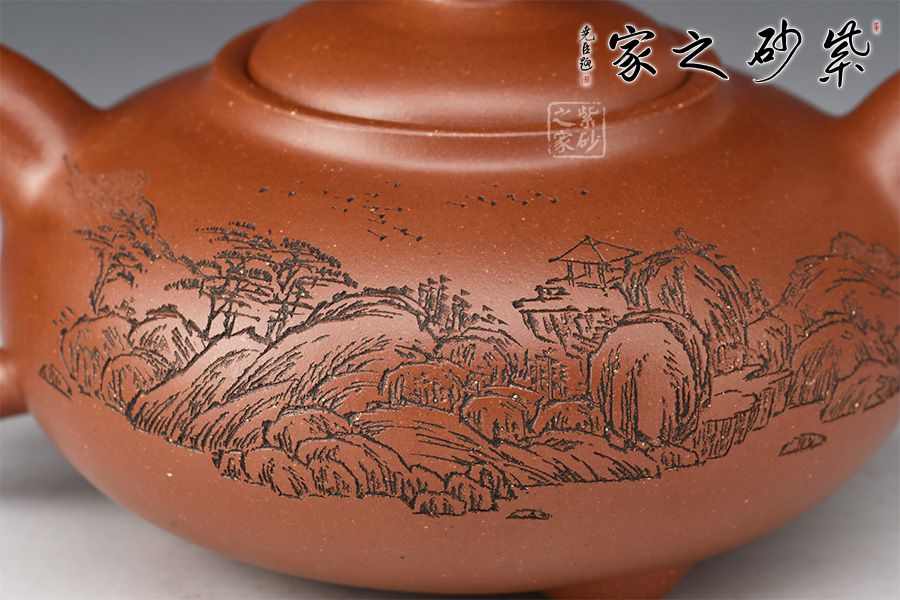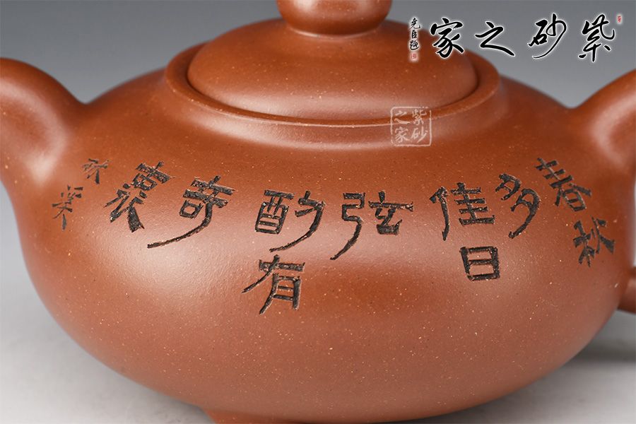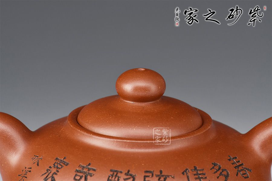 壺身扁圓飽滿,珠鈕、彎流、圈把渾圓胥出,具有道洪風格之遒勁,氣勢雄渾,