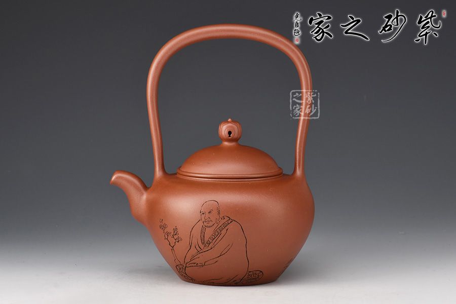 長(zhǎng)眉羅漢·禪提壺壺身呈飽滿圓形,彎流嘴胥出自然,彎曲提梁雙抓壺肩,