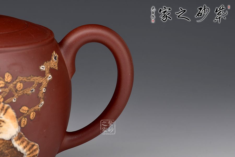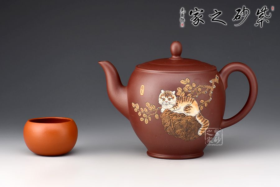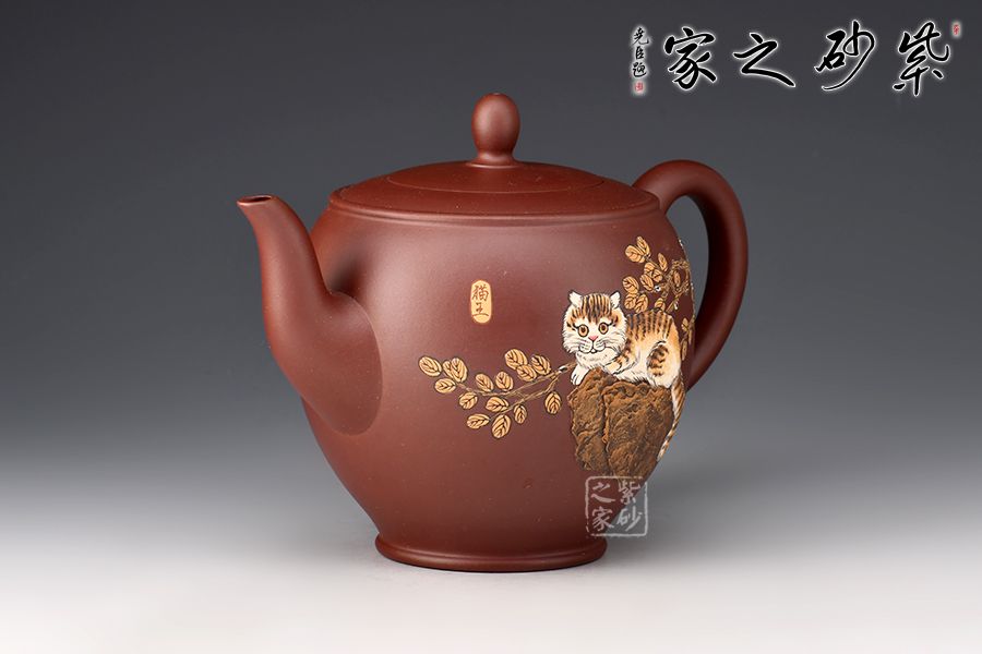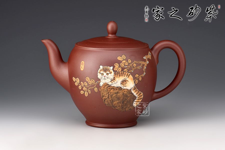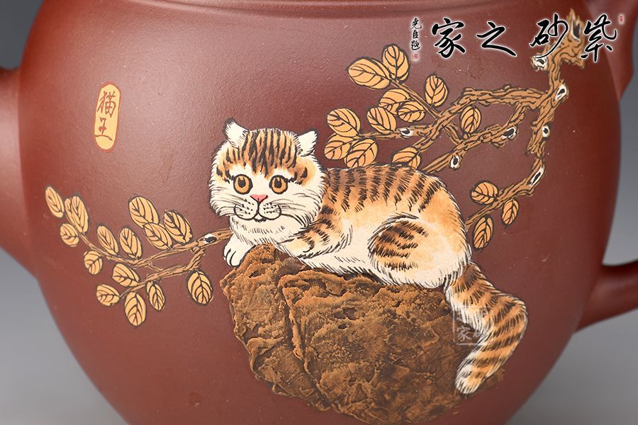整壺穩(wěn)重端莊,壺腹飽滿。平壓蓋吻合嚴密,壺鈕似水滴。壺流二彎,壺基寬闊,耳形把線條流暢,富有動感。壺身由著名畫家顧穎之泥繪,當(dāng)代畫貓第一人/被稱貓王,家有招財貓,時來好運到。整器大方持重,寓意美好,值得推薦!