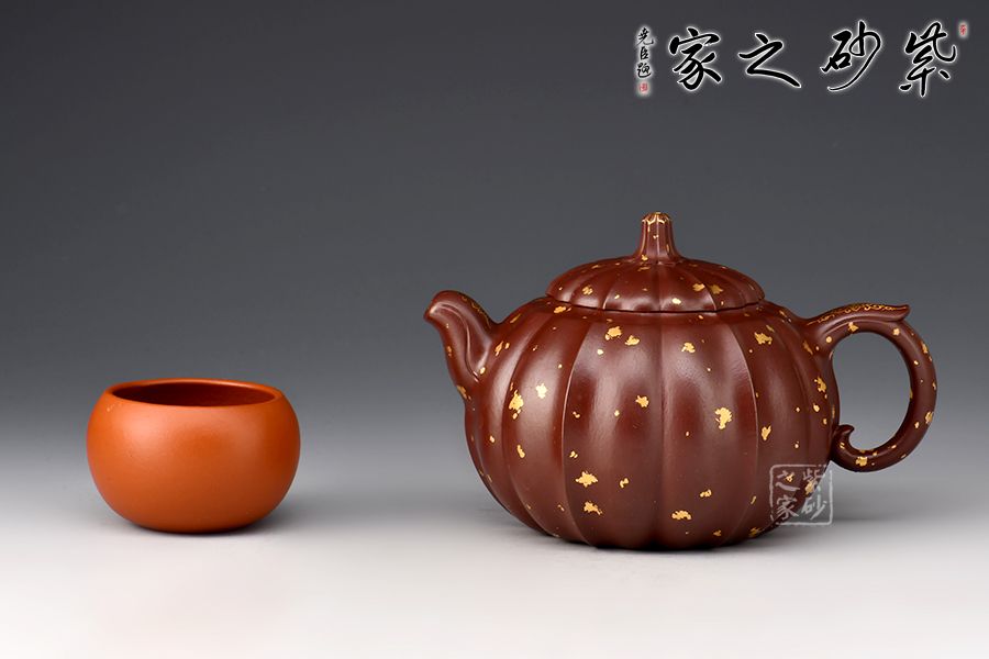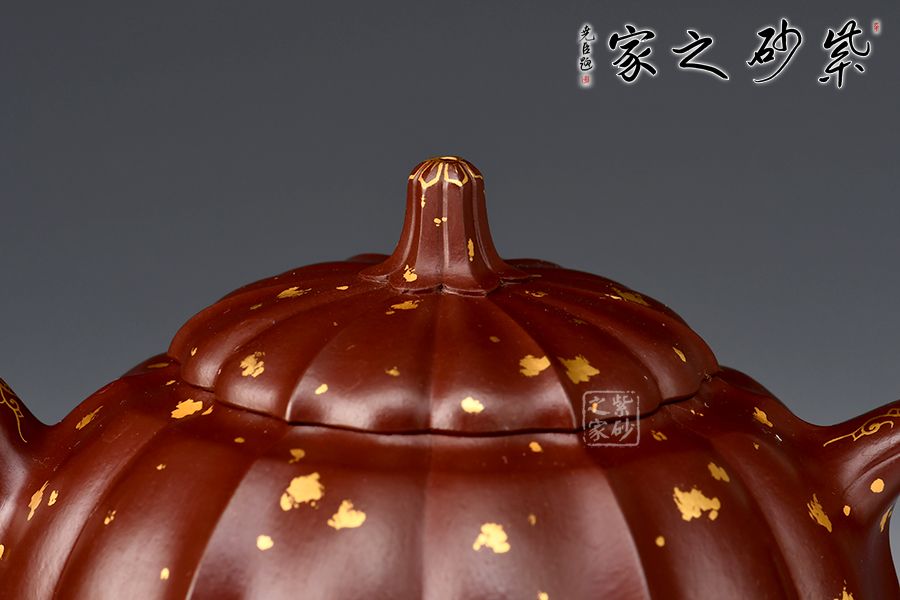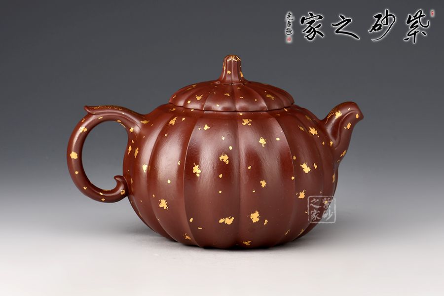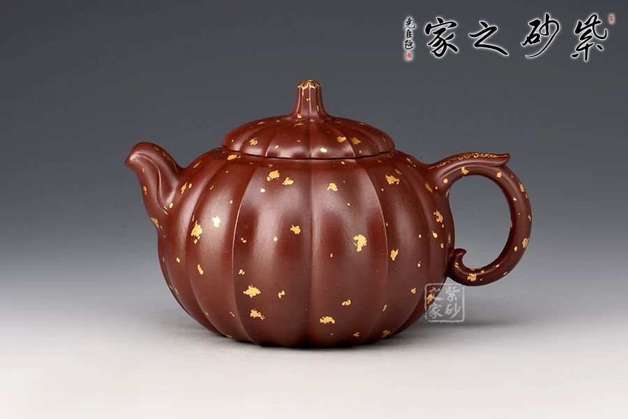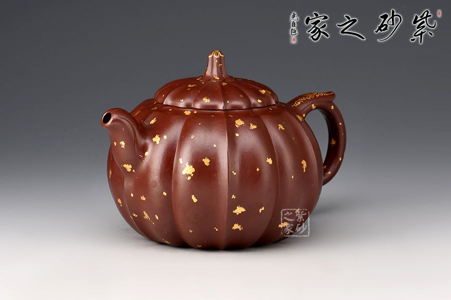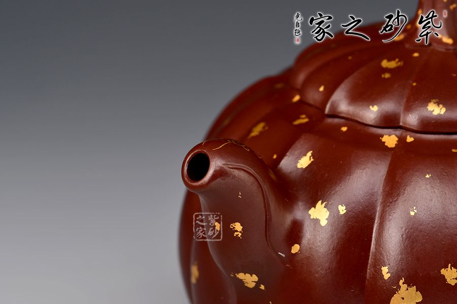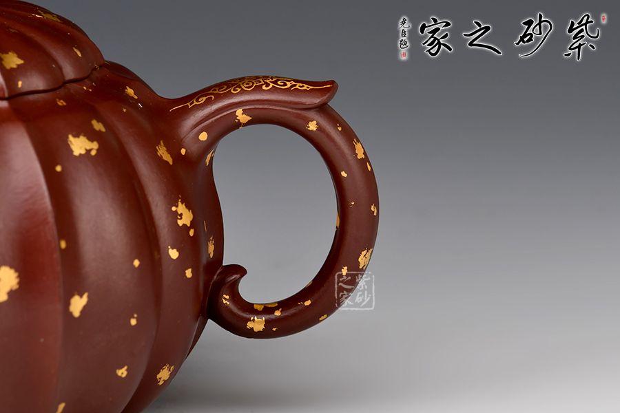整器以南瓜為形,演變而成,壺身由筋囊組成,筋紋流暢,筋囊飽滿,氣韻流暢。高而圓壺身上長瓜蒂壺鈕為壺更添精神,一彎嘴,出水爽利,飛把拿捏舒適。采用家藏紫朱泥,描金灑金技藝,極具質(zhì)感!南瓜寓意金窩福窩,瓜果綿延之意,深受人們喜愛。此器寓意美好,做工精湛,實為邀友品茗至佳器也!