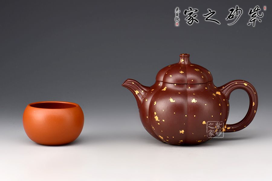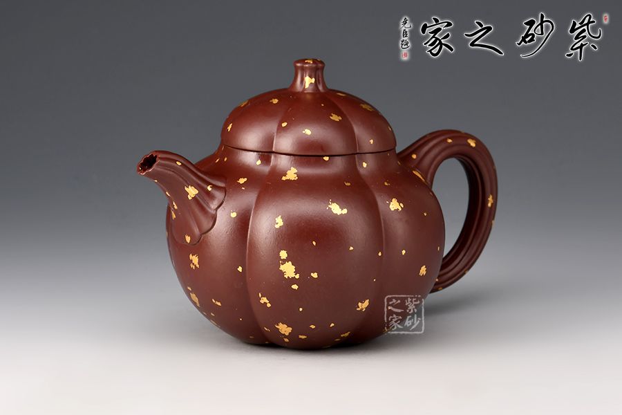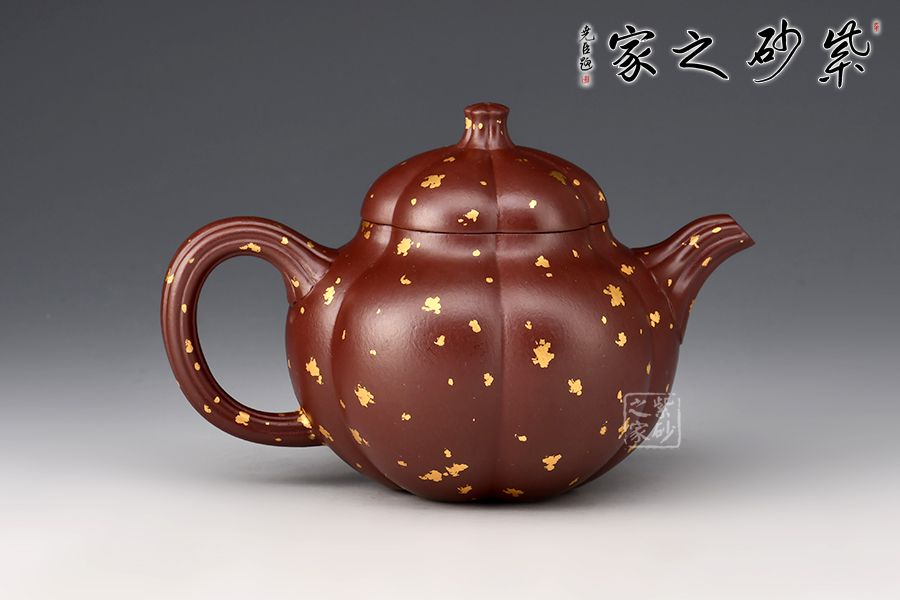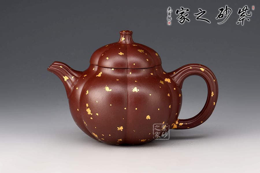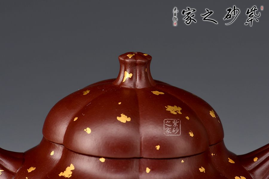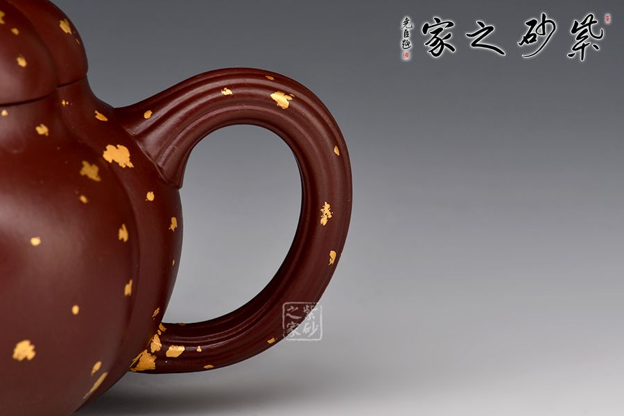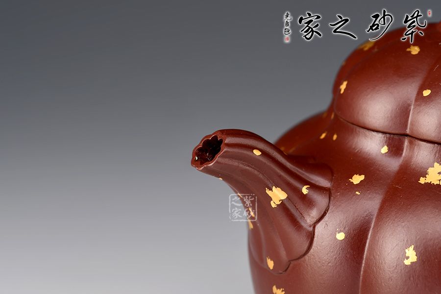 這把“筋紋梨韻”壺以瓜形為壺體,瓜柄為壺鈕,葉脈逼真,構(gòu)思和諧巧妙,取材自然,雅而不俗。壺身圓融作筋紋狀,為六瓣依次圓弧起伏,別有韻味。采用家藏紫朱泥,描金灑金技藝,極具質(zhì)感!