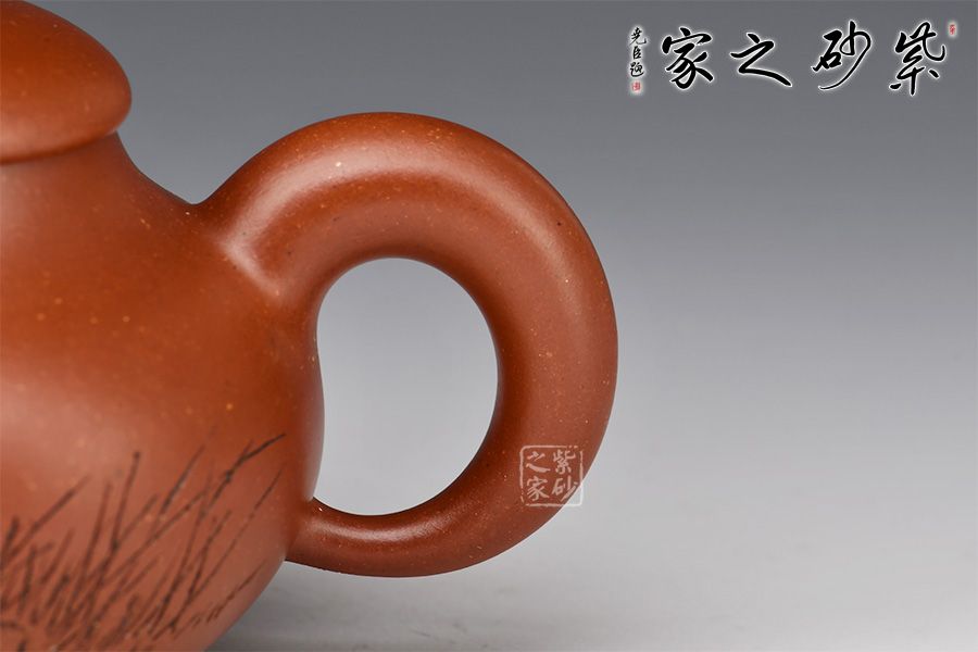 彎流嘴胥出,柔美之姿明顯,耳形壺把優(yōu)雅滑落而下,形成一條圓潤(rùn)飽滿的弧線,