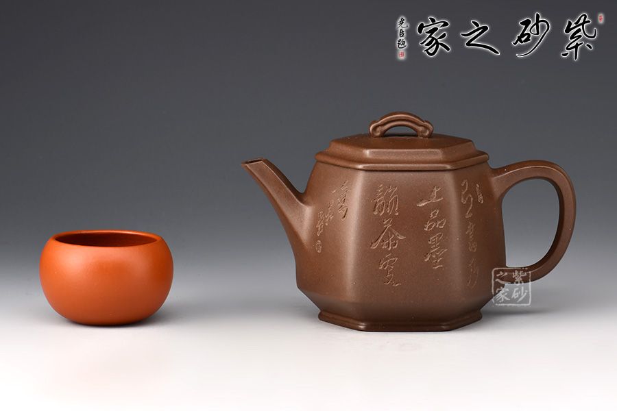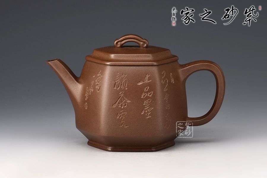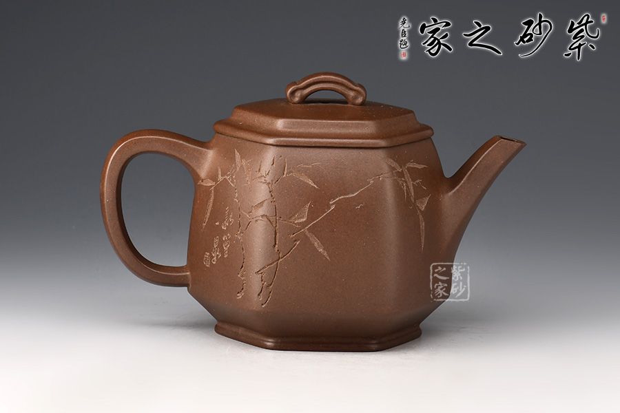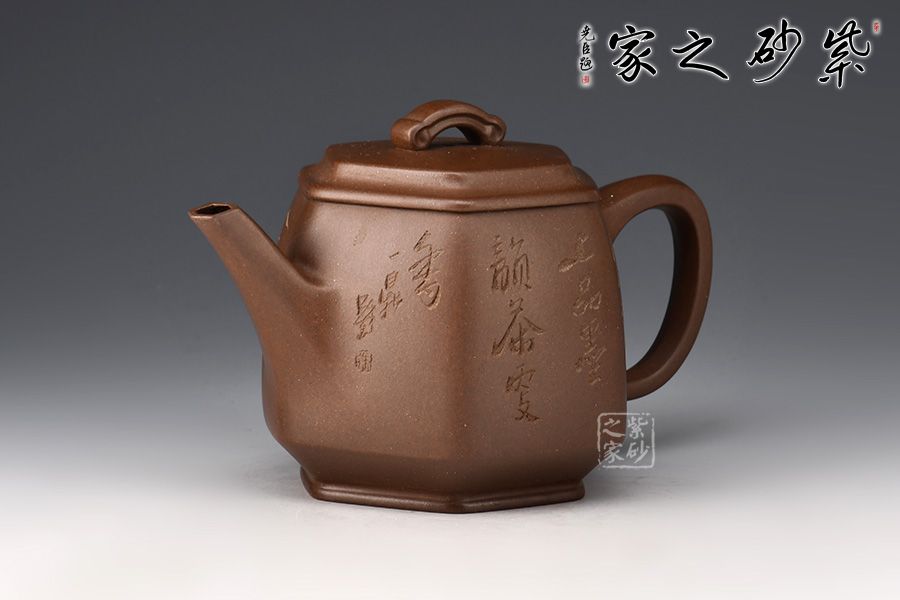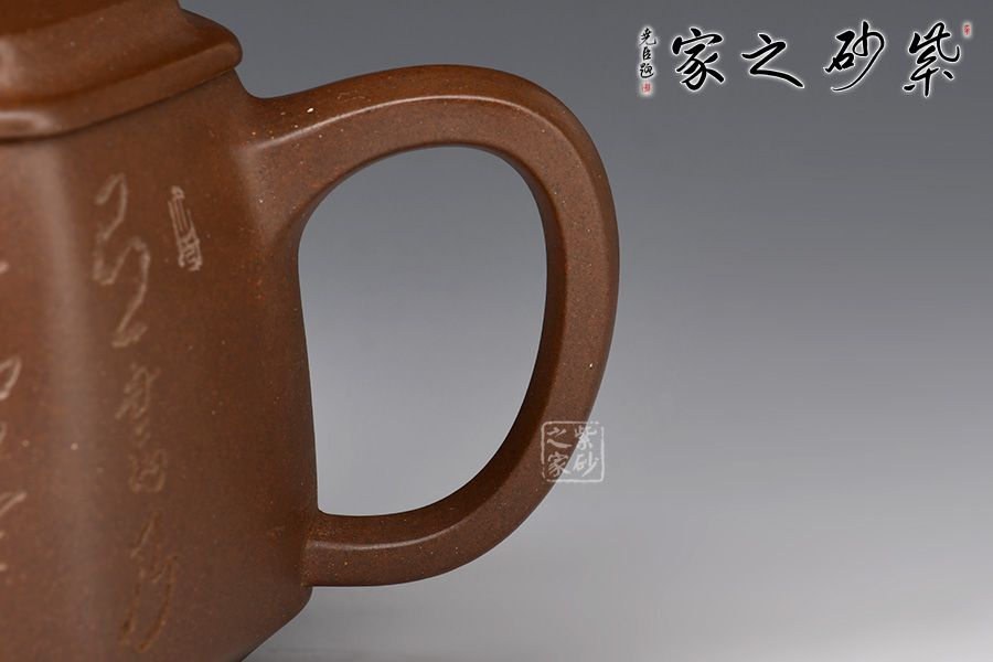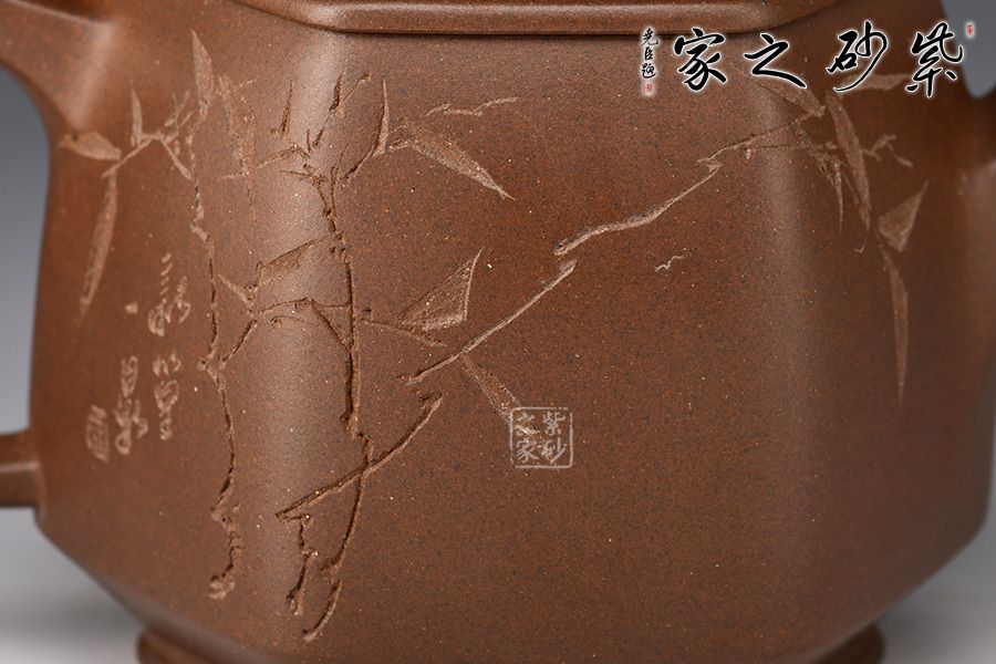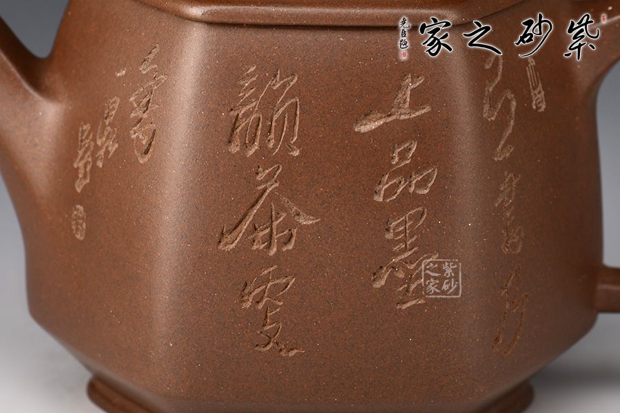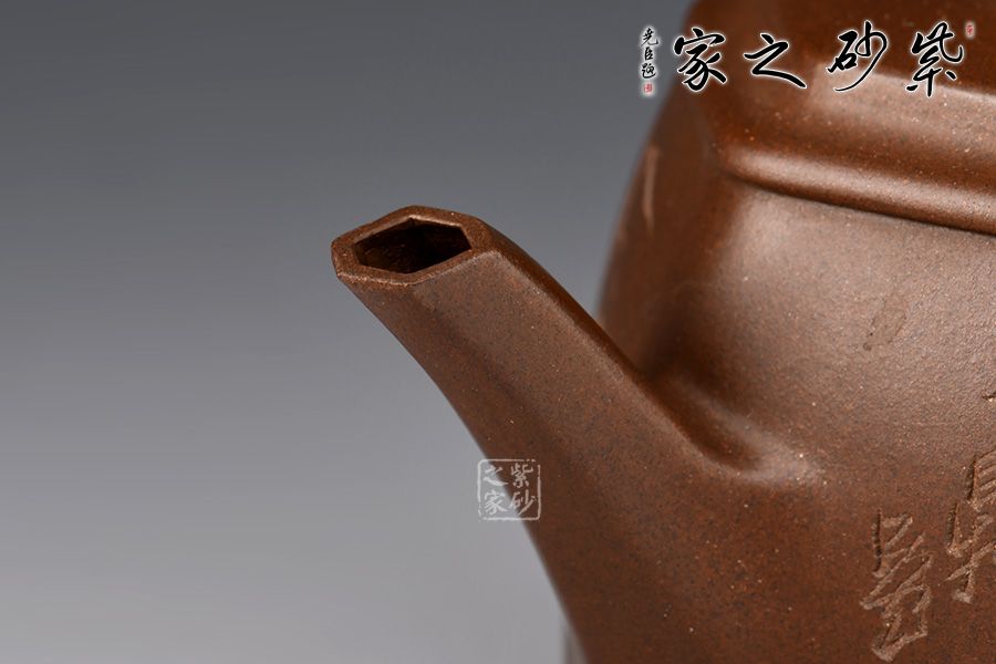 六方長直嘴,出水十分利落;六方耳把粗出細(xì)收,彎曲有致。此壺雖為六方,