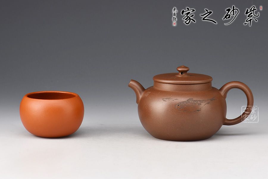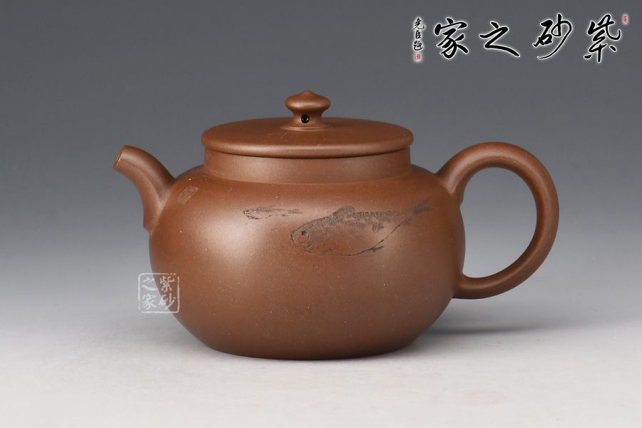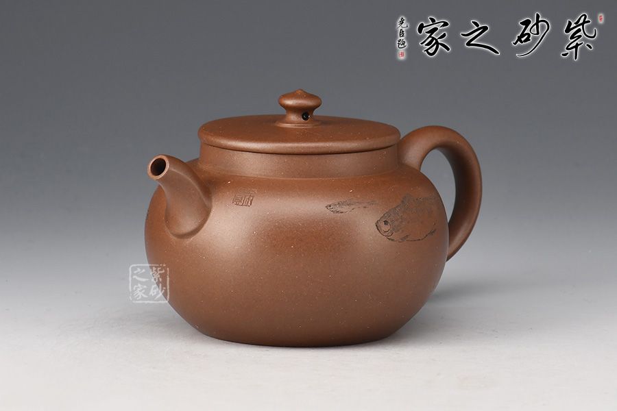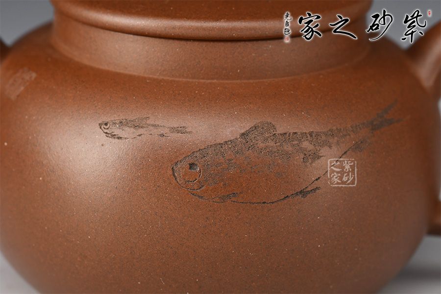 整體豐斂明晰,弧度優(yōu)美,壺身刻繪游魚(yú),氣韻意趣俱佳,實(shí)在是無(wú)可挑剔,