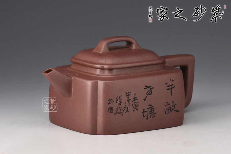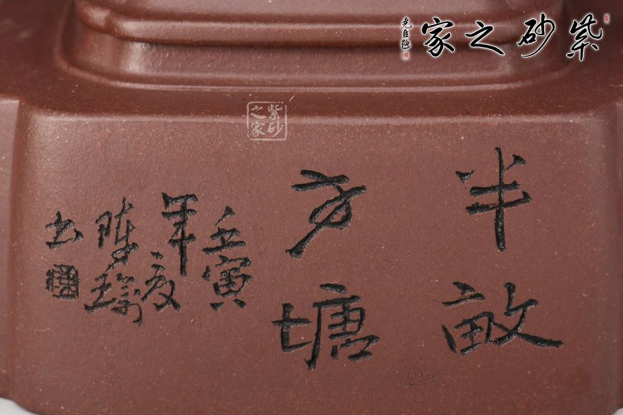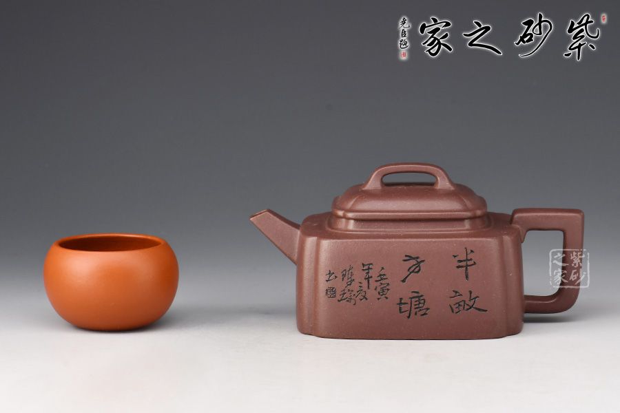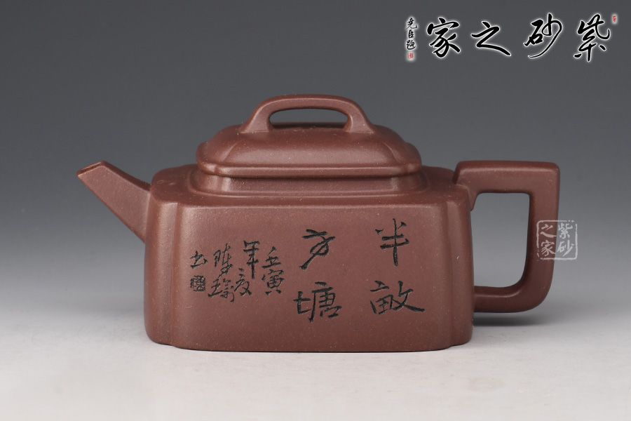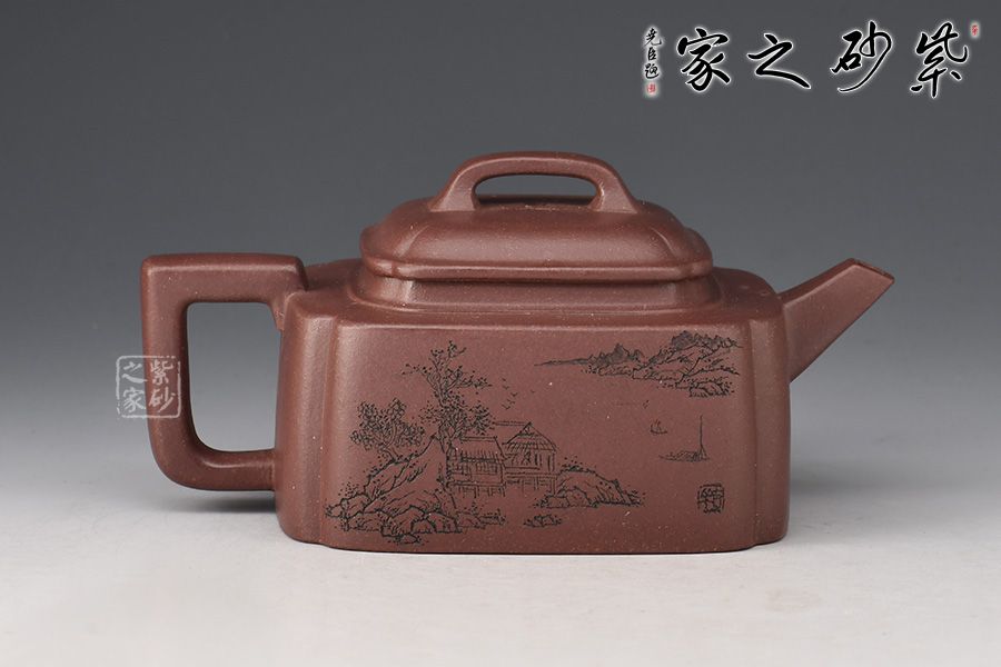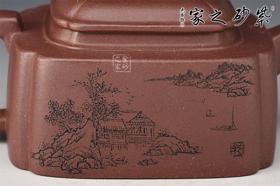 此壺名為半畝方塘,靜謐、雅致。壺身為四方體,采用抽角設(shè)計,棱角分明,過渡自然,壓蓋橋鈕,直流嘴出水暴爽,方形壺把與整壺相稱。此壺不論是泥料還是工藝都嚴(yán)謹(jǐn)考究,多之一分嫌多,少之一分則嫌少。壺身正面刻繪“半畝方塘”四個字,反面配以田園山水圖,山光云影,層巒疊嶂,雅趣十足!此壺?zé)o論自用還是送人都極為推薦!