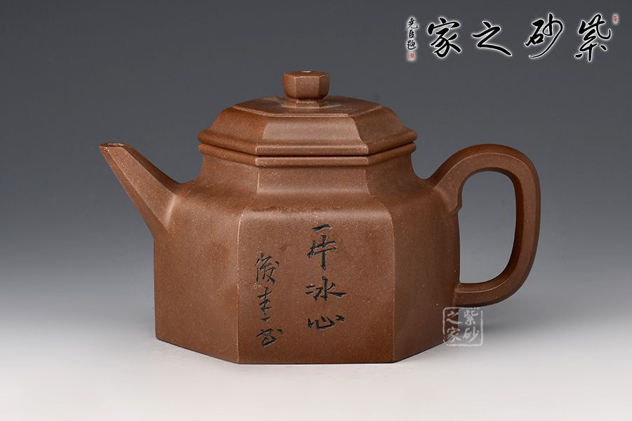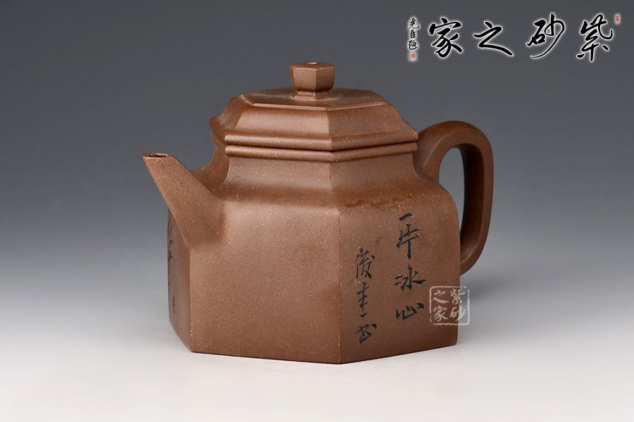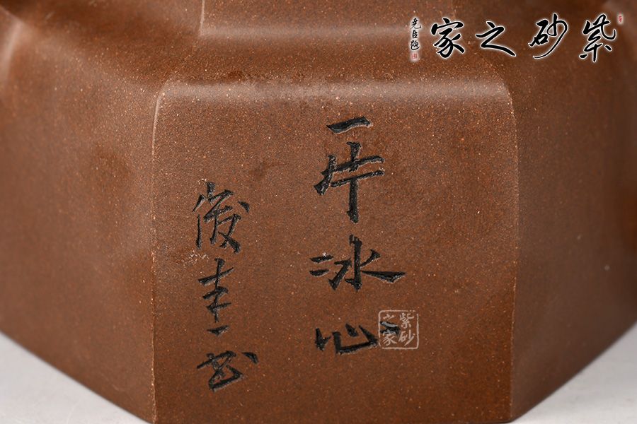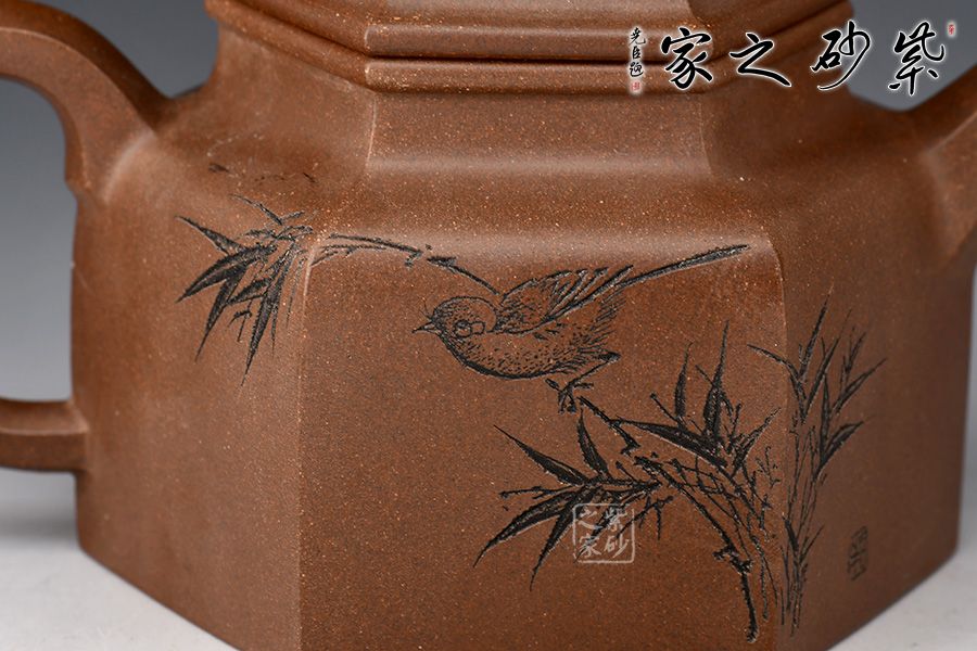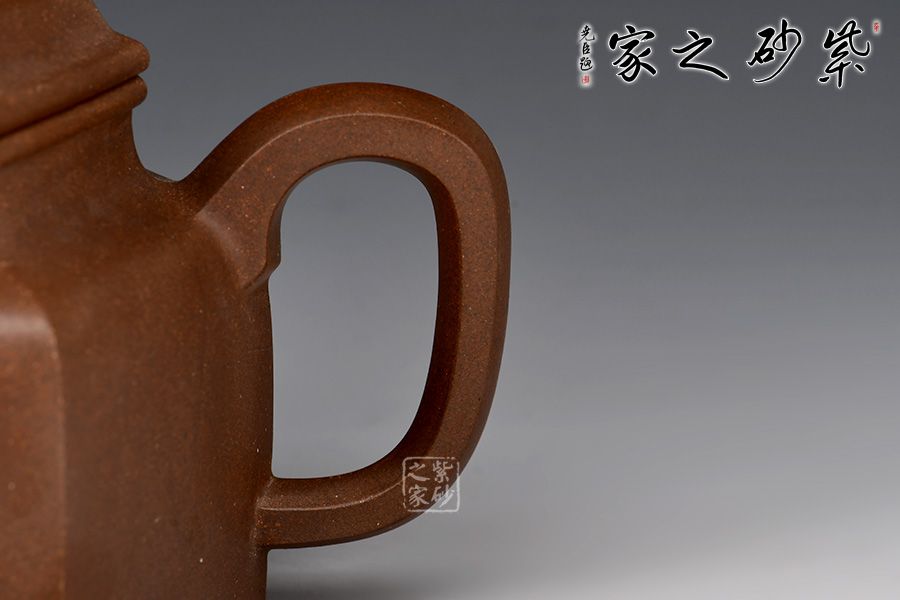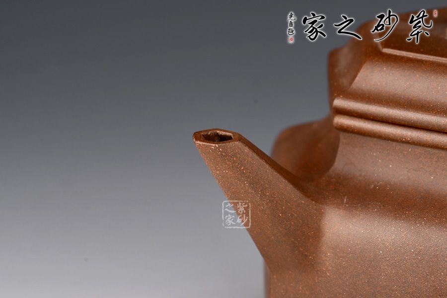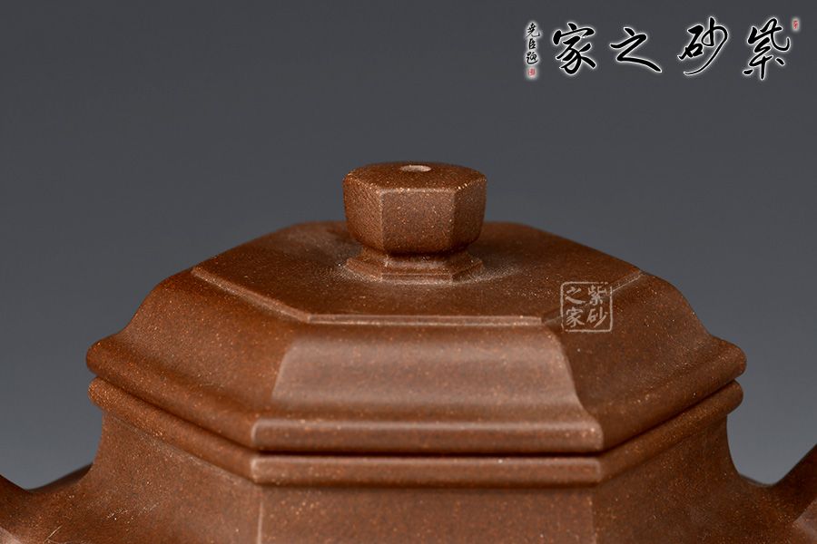 德鐘為經(jīng)典紫砂器型,此壺以德鐘為基礎(chǔ),用方器來(lái)展現(xiàn),造型新奇,莊重大方,尤為體現(xiàn)制壺功力。壺身六方造型由六個(gè)面鑲接,一絲不茍,工整精細(xì),壺蓋和壺鈕也是六方形,工整光滑,線條筆挺,足見(jiàn)制作難度和用心程度。