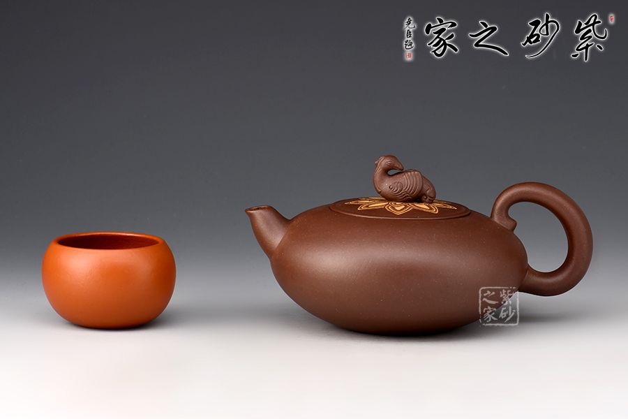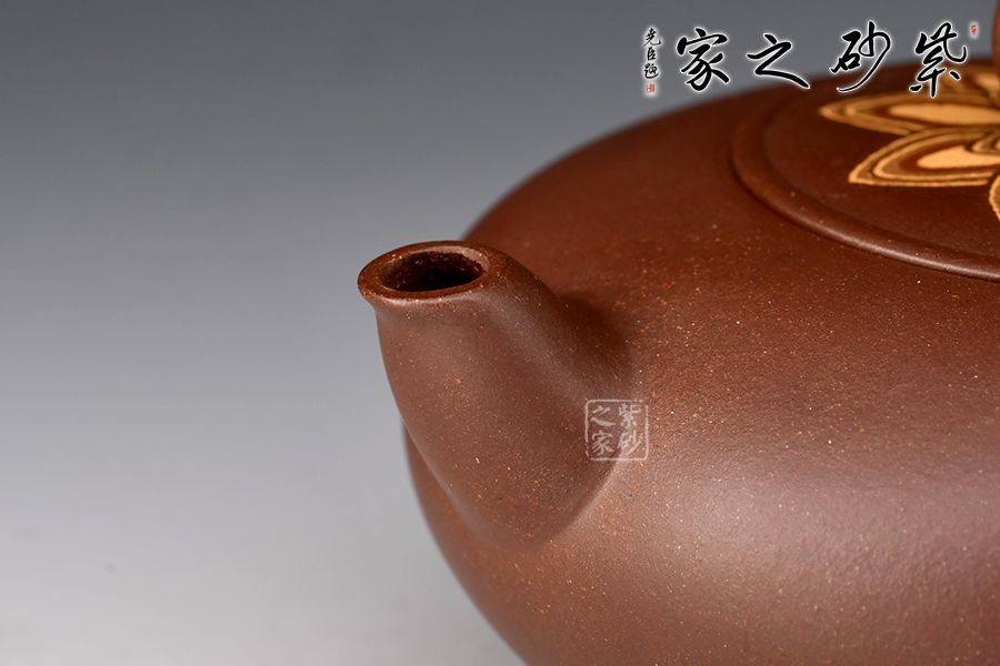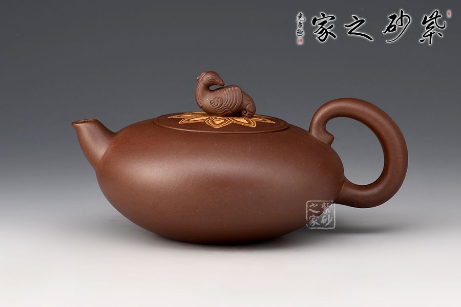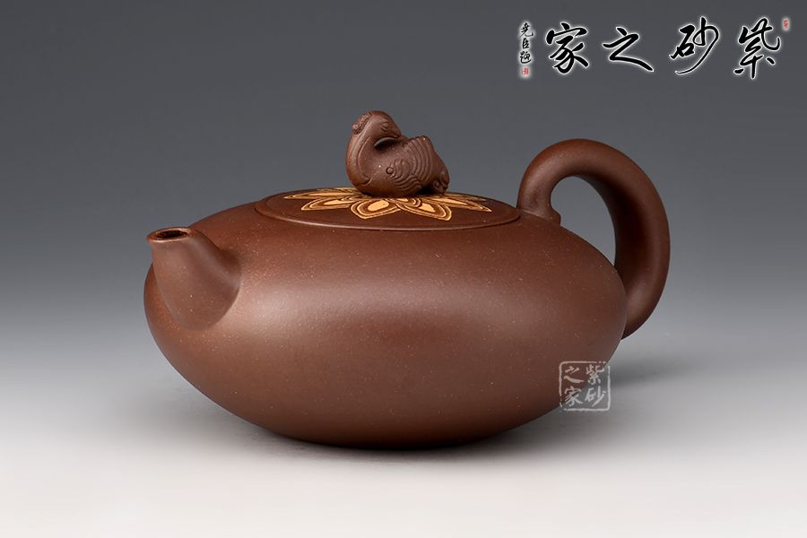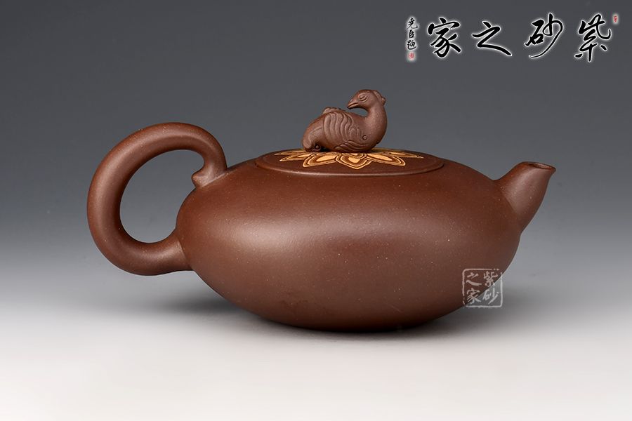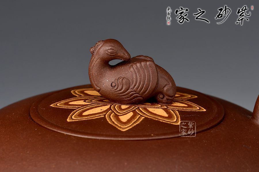 壺身圓潤(rùn)飽滿,壺嘴作鳥喙,飛形壺把似鳥尾,壺鈕雕塑神鳥,刻畫神似,生氣淋漓,神鳥姿態(tài)盡顯。此作屬于惟謹(jǐn)惟細(xì)的精能之作,將人工之巧融匯于形象的妙曼之中,收到了雅俗共賞的藝術(shù)效果。