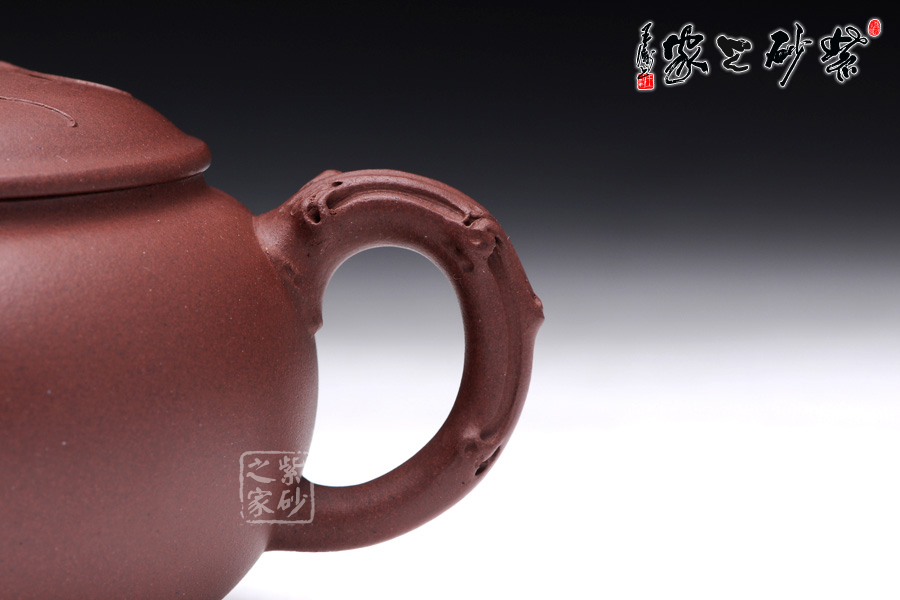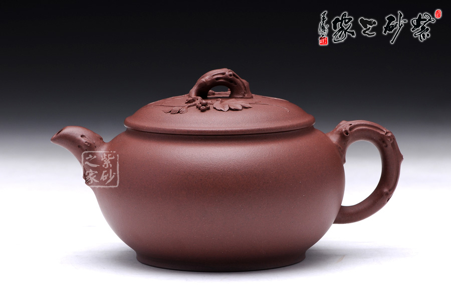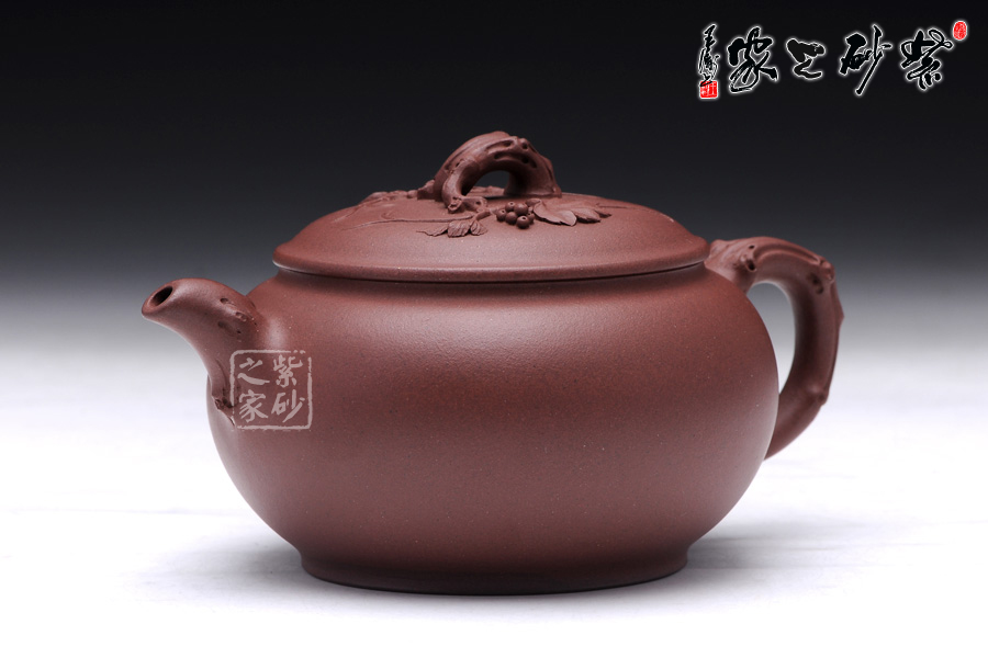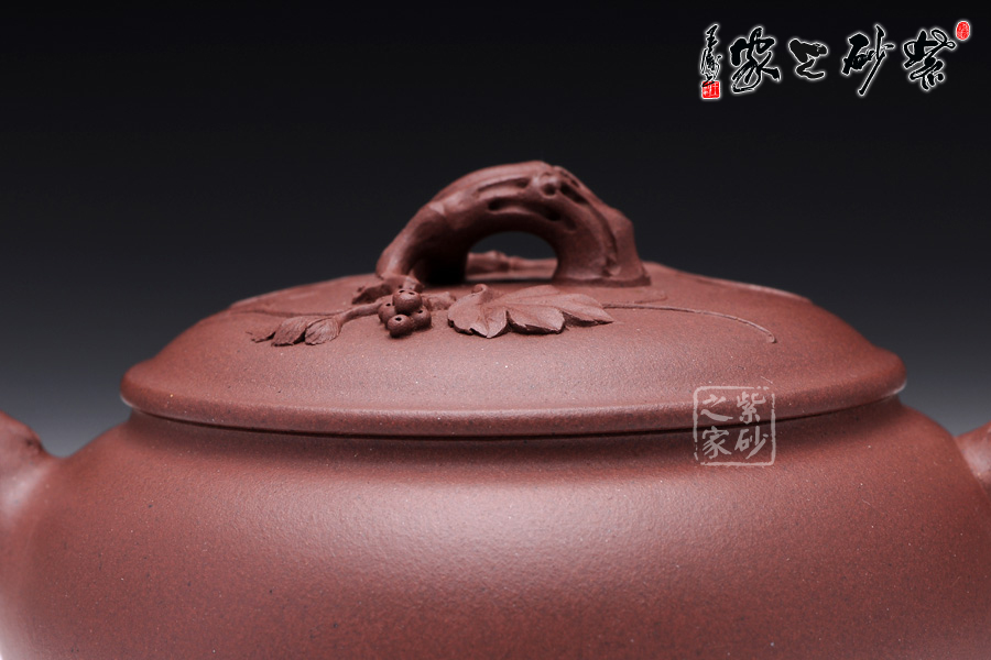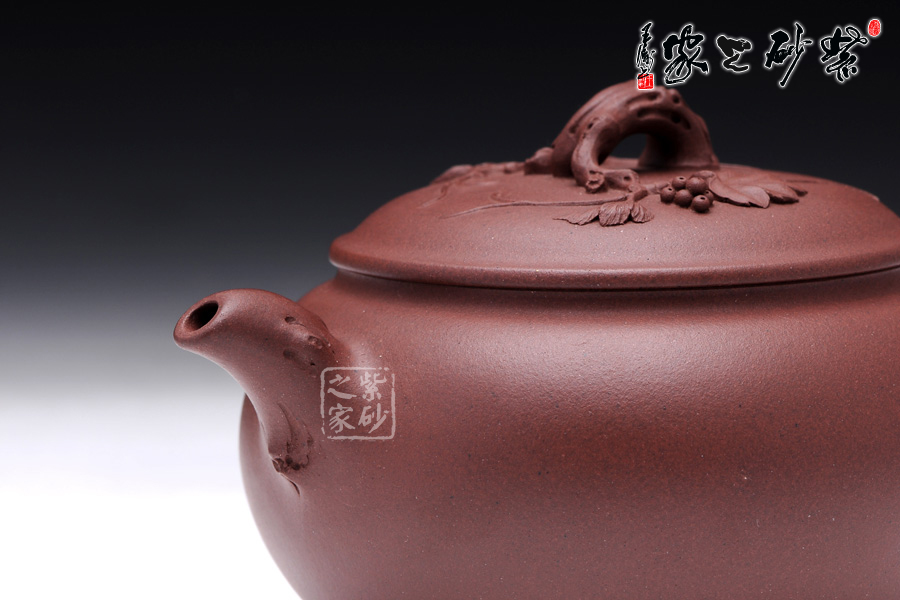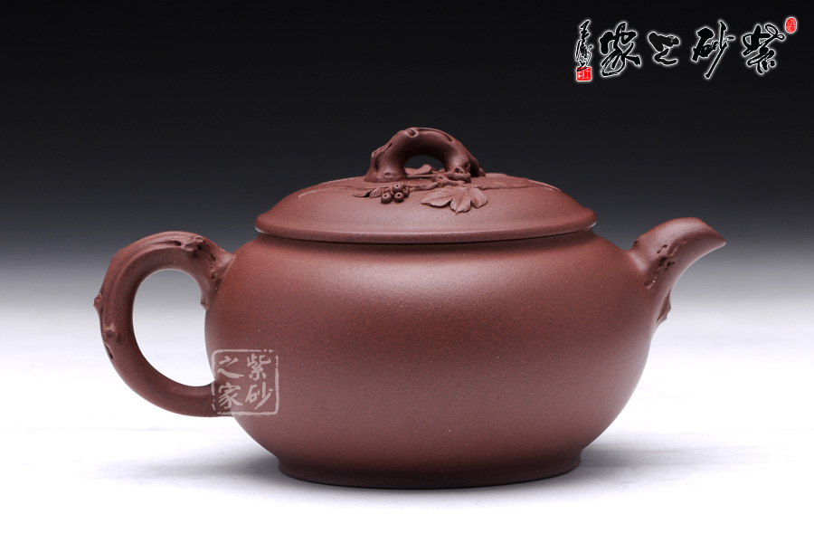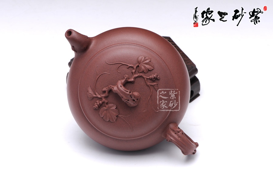 整款壺的韻味就在于豐滿瑩潤(rùn),壺身渾圓飽滿,上下略扁,如一塊光潔潤(rùn)澤的玉璧,觸手生溫,極為可愛;此壺精選紫泥制成, 光素器膚質(zhì)光潔潤(rùn)澤,壺面光滑干凈,毫無裝飾,顯得紅潤(rùn)清雅;而樹枝形的流把在光潔的壺身的襯托下顯得蒼古而有老味;蓋口碩大寬和,平蓋微鼓,樹枝狀橋形鈕極富韻味,而自壺鈕胥出的葡萄貼花可謂工藝不俗,葡萄藤蔓繾綣曼妙,須葉伸展自如,自然傳神;一彎流嘴極短促而精巧,與壺身形成對(duì)比,出水極有勁道,鋼筋中不乏柔勢(shì);耳形端把造型古雅,極為修長(zhǎng)纖細(xì),端握輕盈,孕育剛?cè)嵯酀?jì)之道。