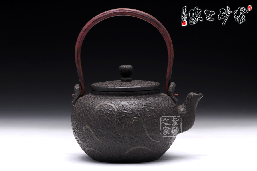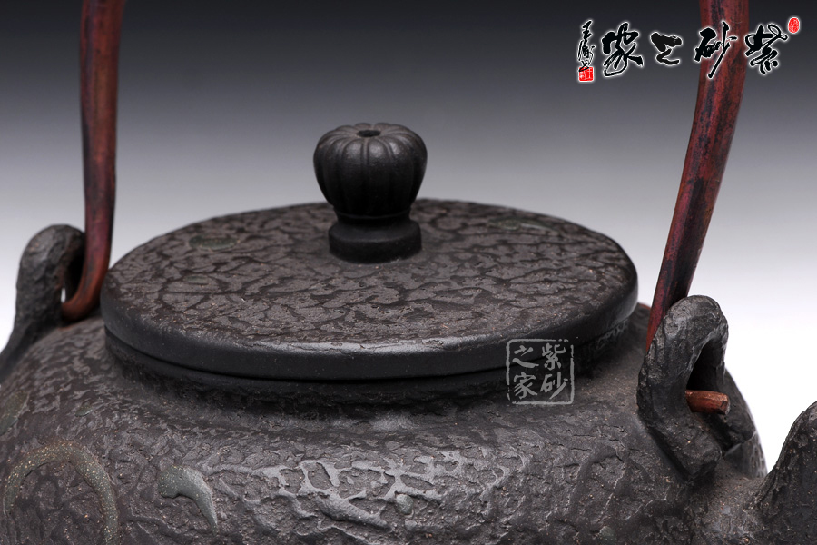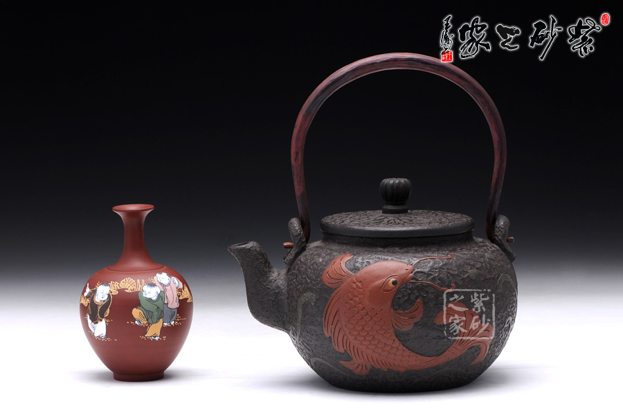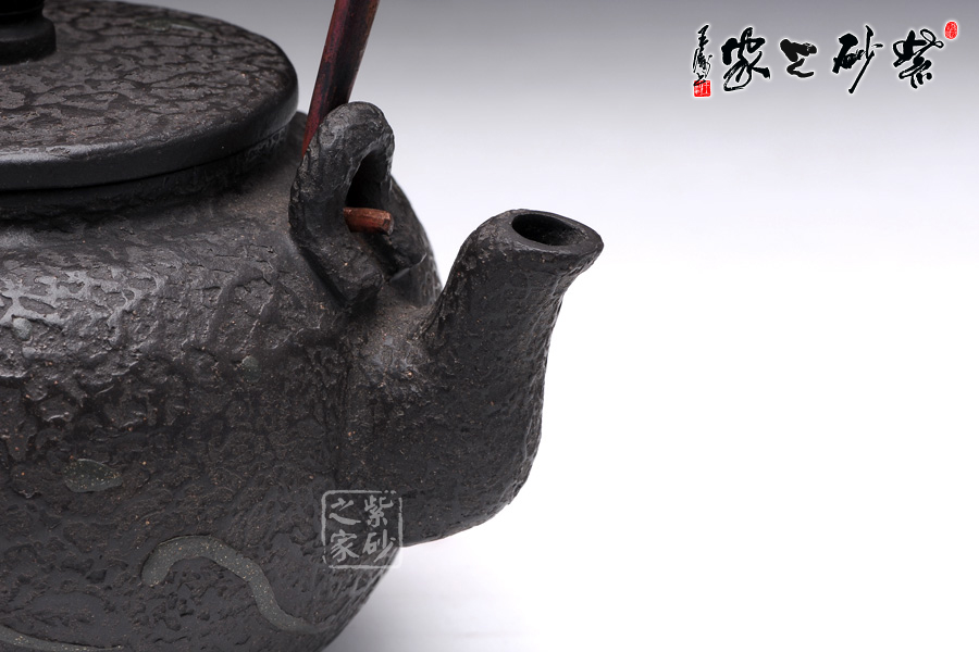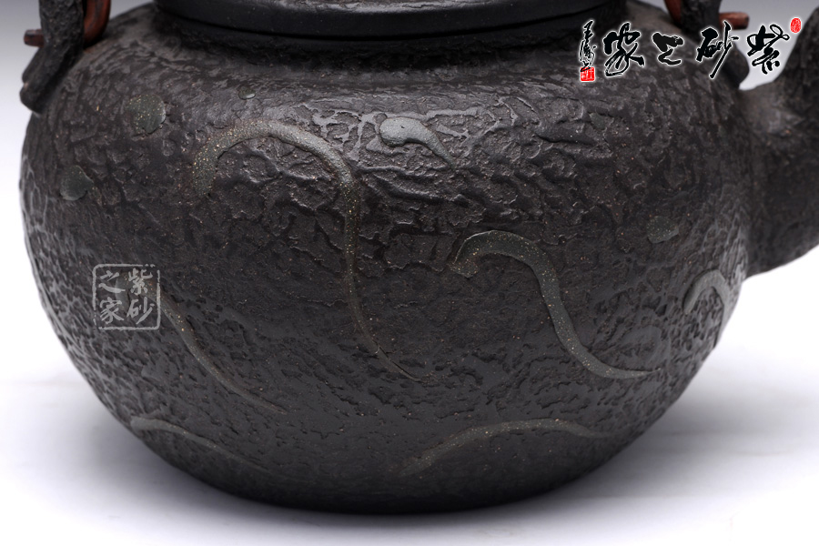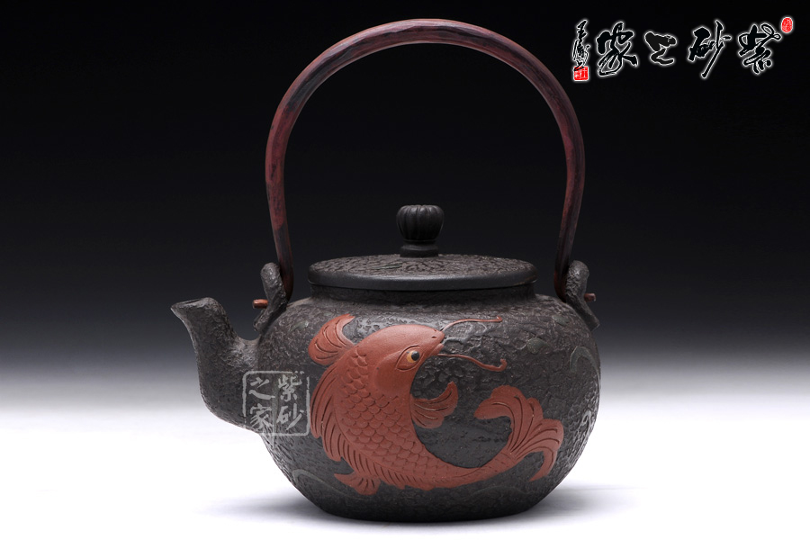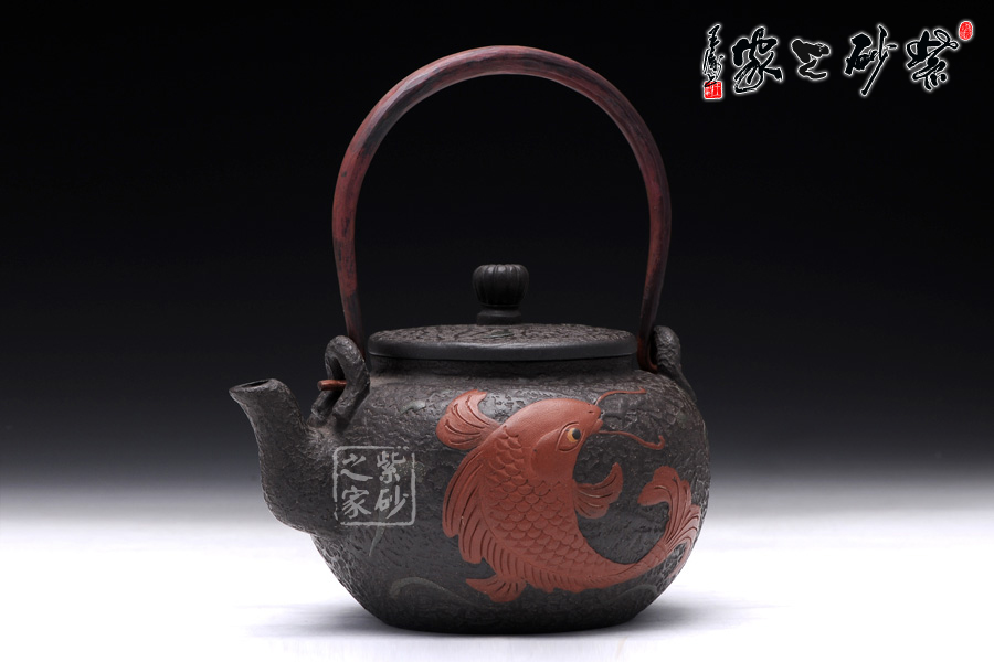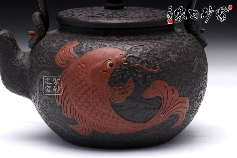 壺身圓潤飽滿,線條流暢,壺身正面用堆花裝飾了一條栩栩如生的大紅鯉魚在洶涌起伏的水面上向上躍起,仿佛鯉魚躍龍門般;嵌蓋設(shè)計(jì),與壺身混若一體,天衣無縫,氣密性良好,點(diǎn)睛之處在于壺鈕,一尊威猛霸氣的獅子立于壺蓋之上;經(jīng)典的三彎流,嘴型古樸蜿蜒,線條優(yōu)雅,出水利落;做舊處理的銅質(zhì)提梁與色澤神秘沉郁的黑星砂搭配,整體感覺古雅大氣,敦厚穩(wěn)重;此壺做工精細(xì),用料講究,實(shí)為收藏之精品。