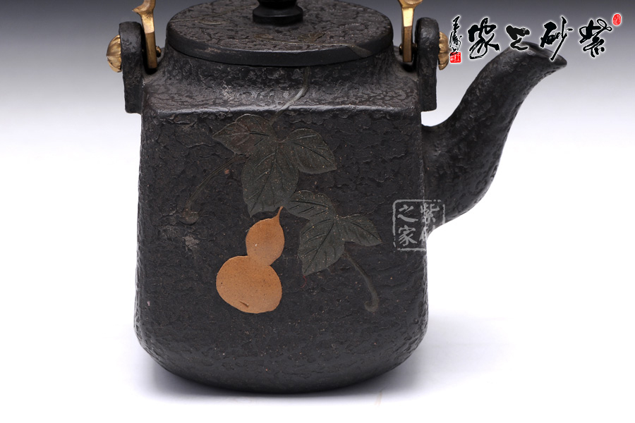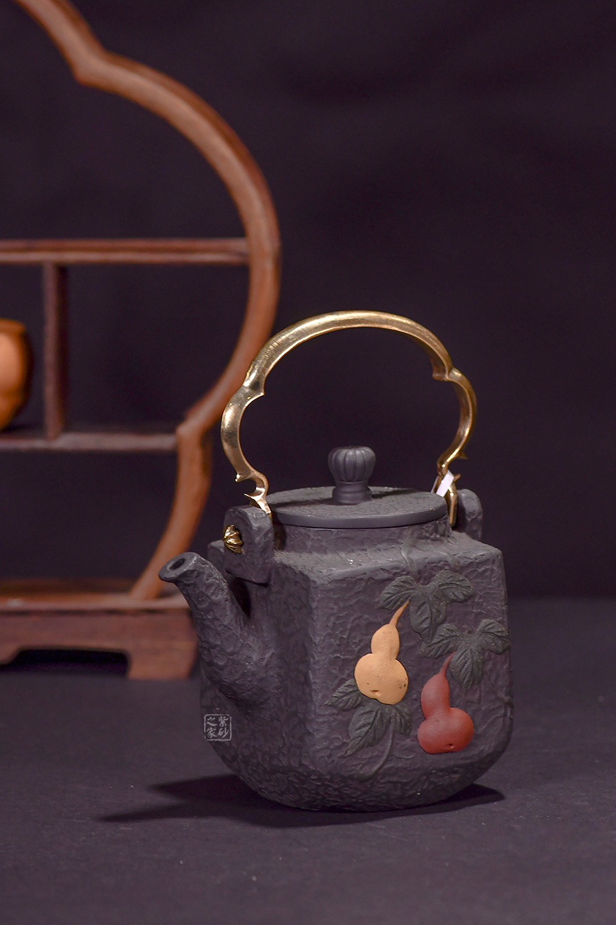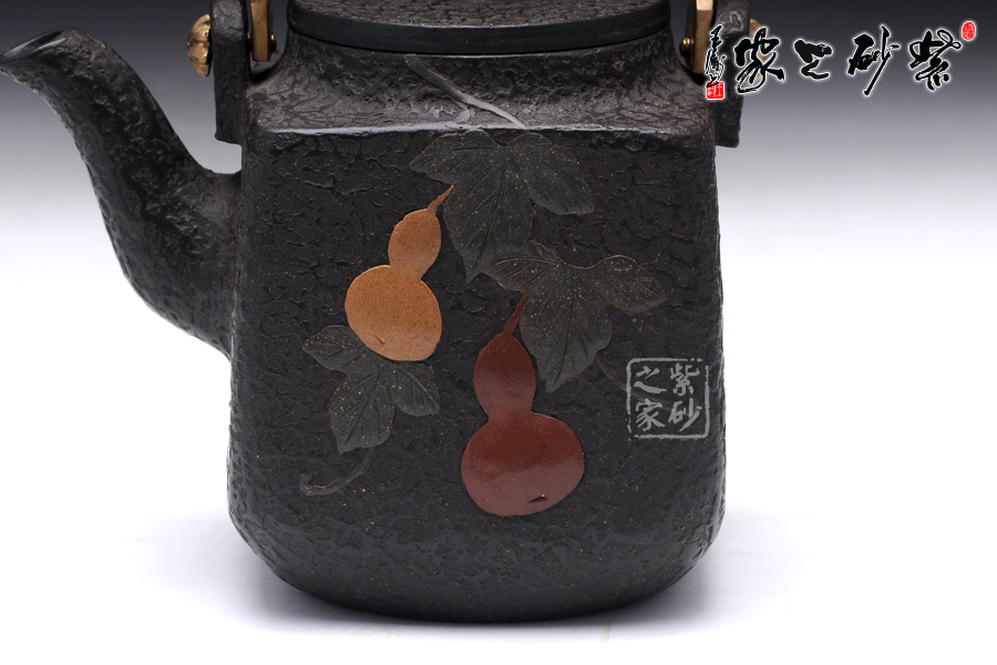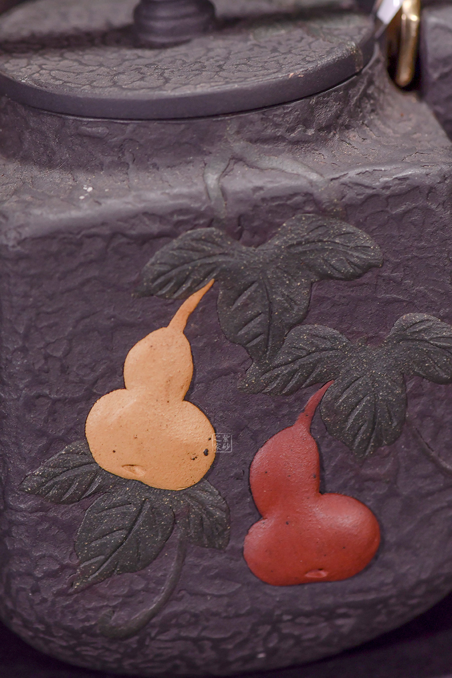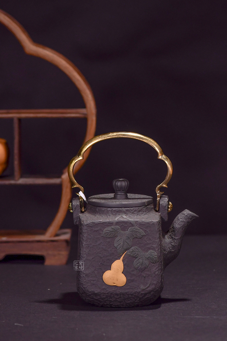 此壺造型為四方形,身筒較高,氣勢威嚴(yán),四面轉(zhuǎn)角溫婉,壺底呈混四方形,壺肩則更為明利直接,短頸圓口平蓋,蓋面平實簡約,完美貼合,氣密性良好,壺鈕如花苞般,含苞待放;經(jīng)典的三彎流,嘴型古樸蜿蜒,線條優(yōu)雅,出水利落;銅質(zhì)提梁與色澤神秘沉郁的黑星砂搭配,整體感覺古雅大氣,敦厚穩(wěn)重;此壺做工精細(xì),用料講究,實為收藏之精品;壺身兩面堆花裝飾十分精湛,藤蔓上幾只葫蘆生長自然,意蘊悠悠,葫蘆又有“福祿”之意,是吉祥的好兆頭。