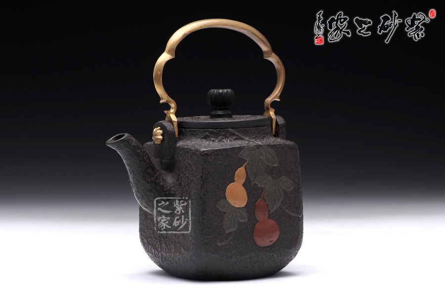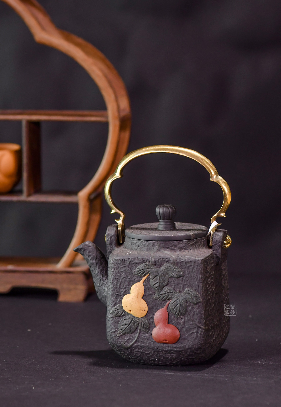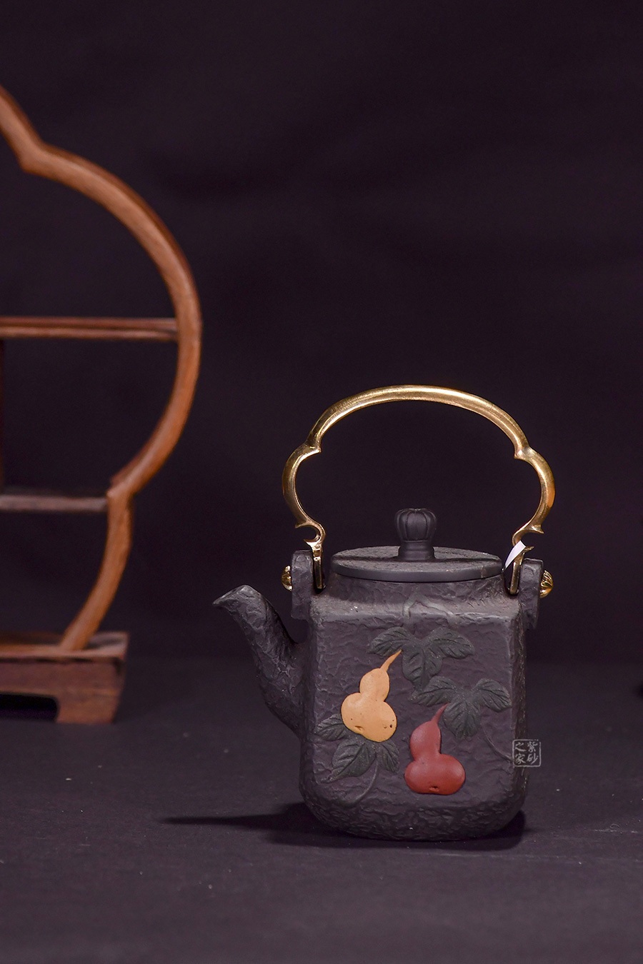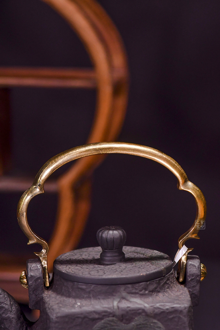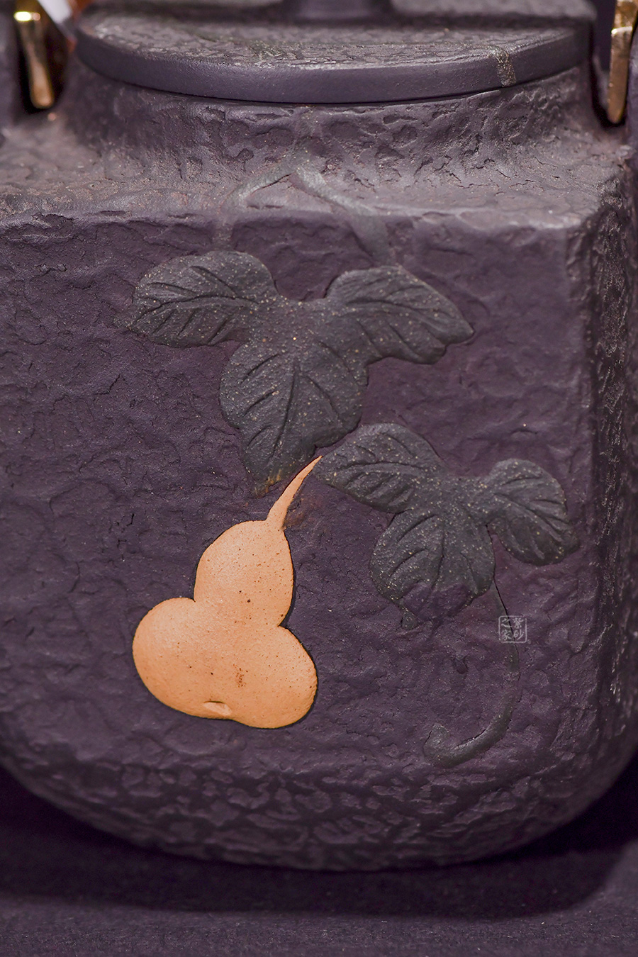 此壺造型為四方形,身筒較高,氣勢威嚴(yán),四面轉(zhuǎn)角溫婉,壺底呈混四方形,壺肩則更為明利直接,短頸圓口平蓋,蓋面平實簡約,完美貼合,氣密性良好,壺鈕如花苞般,含苞待放;經(jīng)典的三彎流,嘴型古樸蜿蜒,線條優(yōu)雅,出水利落;銅質(zhì)提梁與色澤神秘沉郁的黑星砂搭配,整體感覺古雅大氣,敦厚穩(wěn)重;此壺做工精細(xì),用料講究,實為收藏之精品;壺身兩面堆花裝飾十分精湛,藤蔓上幾只葫蘆生長自然,意蘊悠悠,葫蘆又有“福祿”之意,是吉祥的好兆頭。
