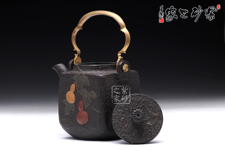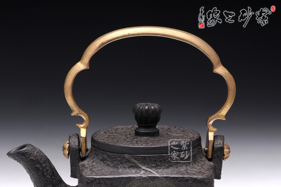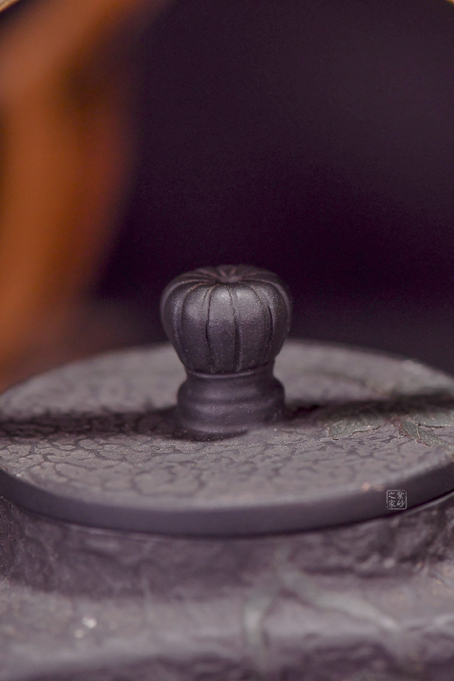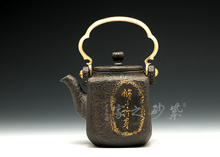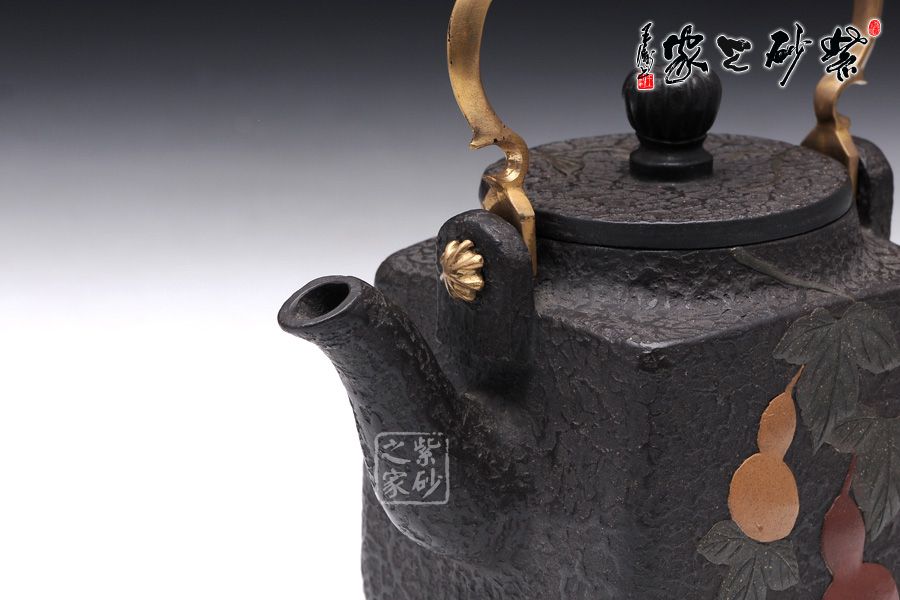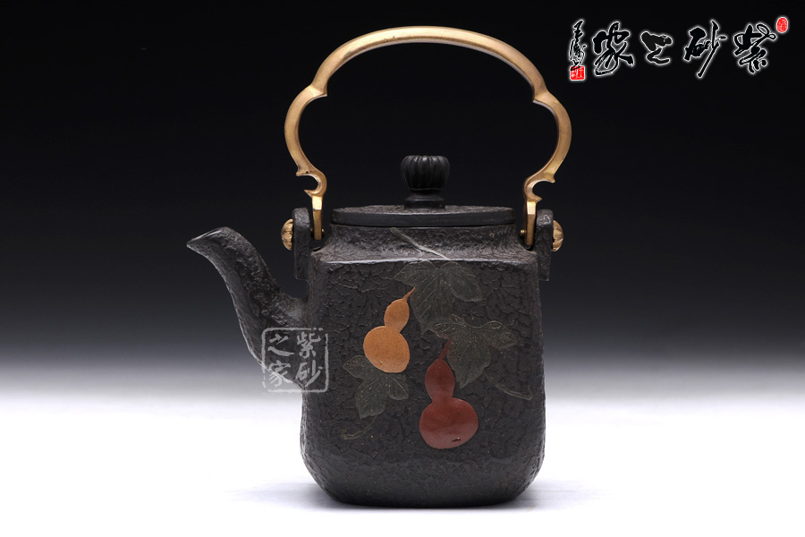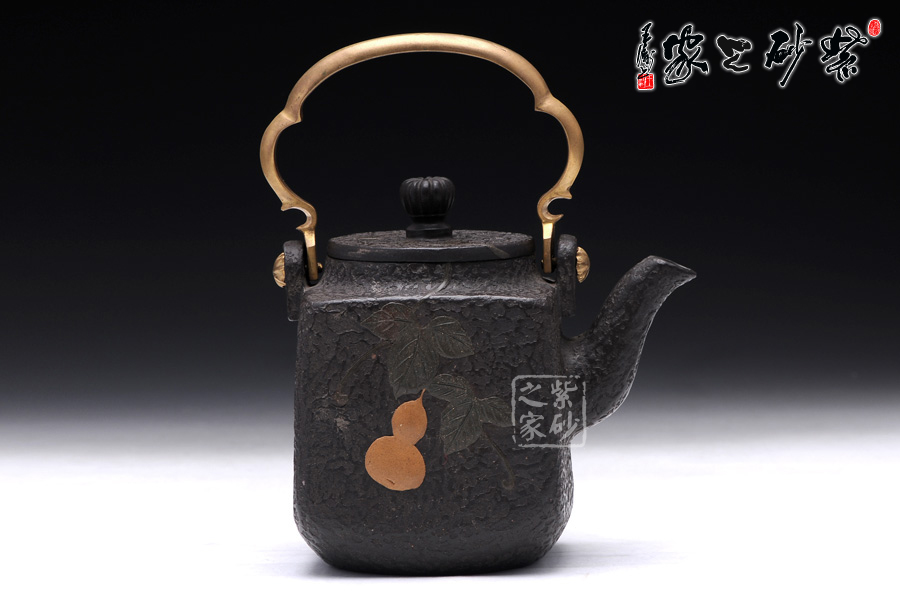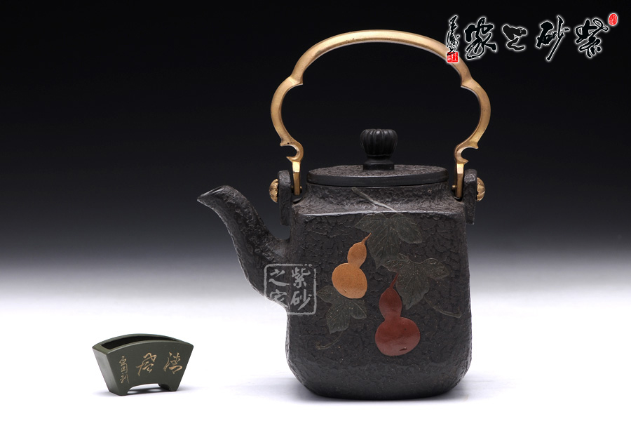 此壺造型為四方形,身筒較高,氣勢威嚴(yán),四面轉(zhuǎn)角溫婉,壺底呈混四方形,壺肩則更為明利直接,短頸圓口平蓋,蓋面平實簡約,完美貼合,氣密性良好,壺鈕如花苞般,含苞待放;經(jīng)典的三彎流,嘴型古樸蜿蜒,線條優(yōu)雅,出水利落;銅質(zhì)提梁與色澤神秘沉郁的黑星砂搭配,整體感覺古雅大氣,敦厚穩(wěn)重;此壺做工精細(xì),用料講究,實為收藏之精品;壺身兩面堆花裝飾十分精湛,藤蔓上幾只葫蘆生長自然,意蘊悠悠,葫蘆又有“福祿”之意,是吉祥的好兆頭。