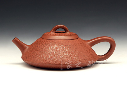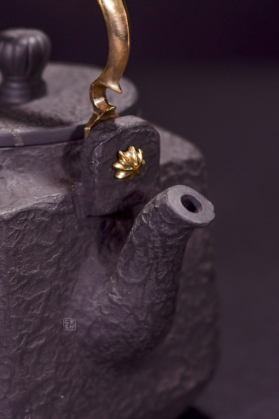 此壺為紫砂仿鐵壺,近幾年刮起了一股日本鐵壺風(fēng),日本鐵壺以其獨有的古樸造型闖入我們的視野,盧建國老師的這幾款紫砂仿鐵壺就是在日本鐵壺的造型而制成的。老師精選了與鐵壺顏色相似黑星砂泥料制作而成,壺身也特別仿制了日本鐵壺獨有的不規(guī)則花紋,淺棕色含細(xì)玄色顆粒,光彩溫潤討喜,乃礦中極品。