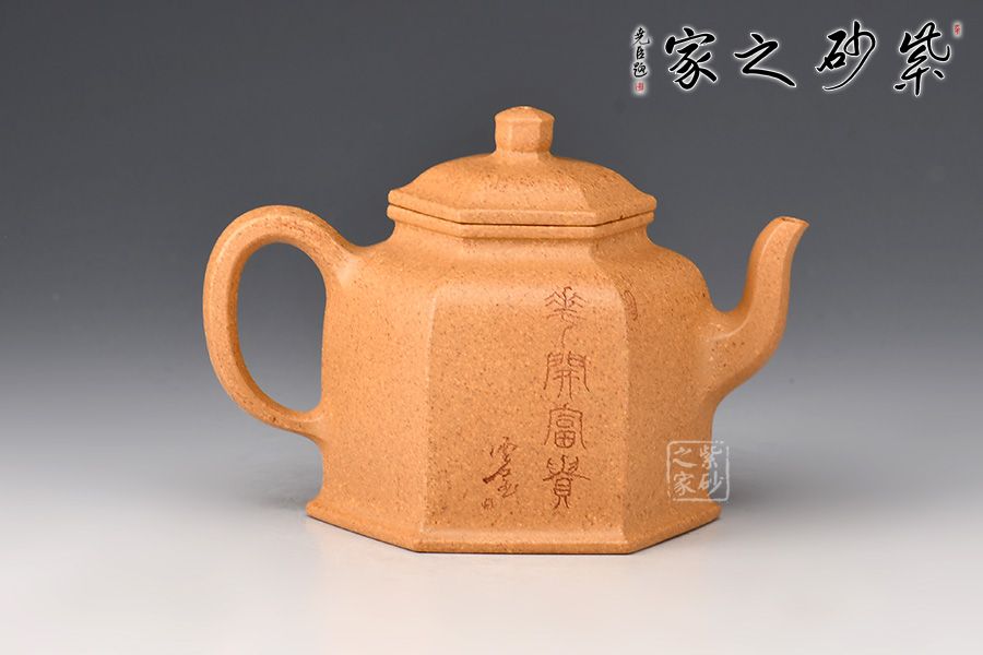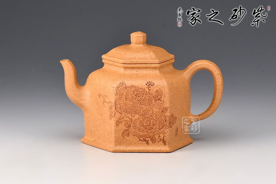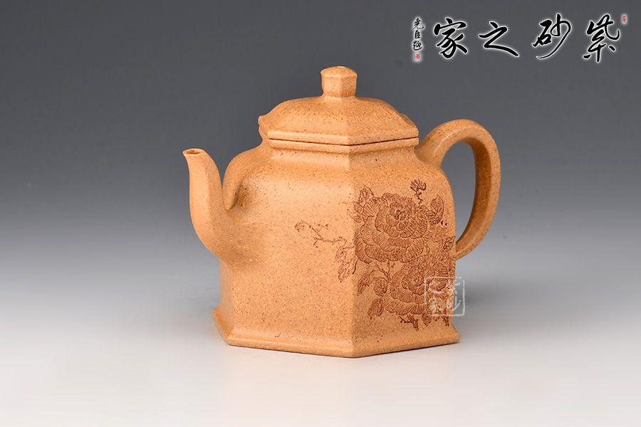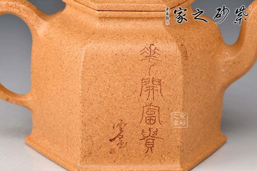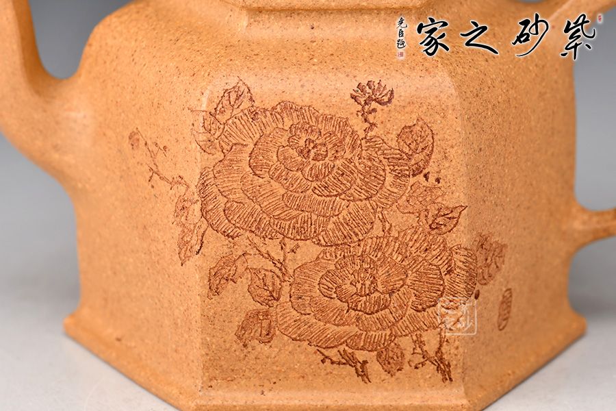 雙面陶刻,正面刻繪牡丹花,雍容華貴,反面刻繪“富貴花開”四個(gè)大字,前后呼應(yīng),意境深遠(yuǎn)。整體看此六方壺,端莊沉穩(wěn),器宇軒昂,刻飾豐富,不僅具備極強(qiáng)的實(shí)用性,同時(shí)還兼具陳設(shè)性、觀賞性,推薦收藏。