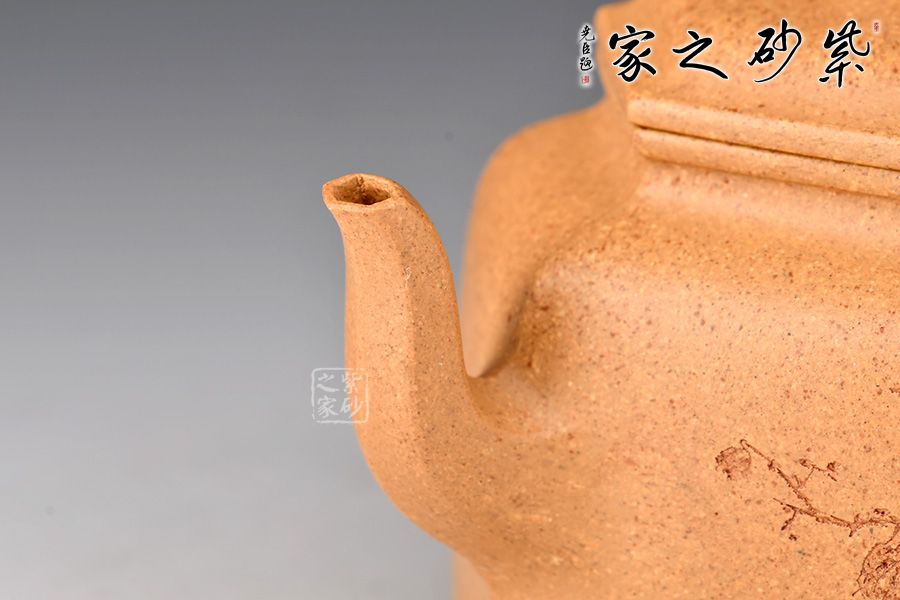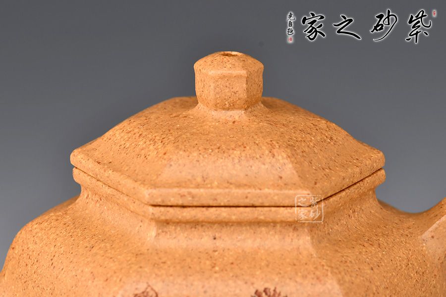此壺身筒高挺,線條挺括,壺身由六片大小相同的長方泥塊鑲接組成,形態(tài)自然,無銜接之感。三彎流出水爽利,耳形以六條棱線修飾,寓方于圓,更顯大方。蓋面亦六方,口蓋嚴(yán)絲合縫,隨意轉(zhuǎn)動(dòng)皆可吻合。以六方立體形蓋鈕為中心點(diǎn),通貫六棱,直達(dá)壺底,線與線、線與面形成起伏節(jié)奏,剛?cè)岵?jì)。
