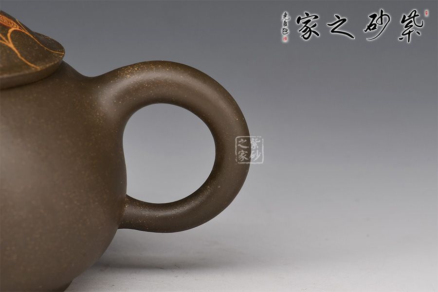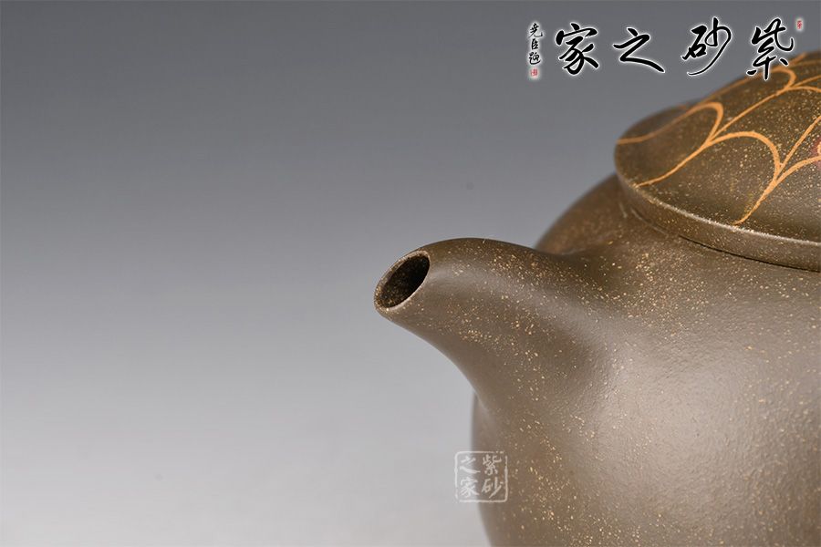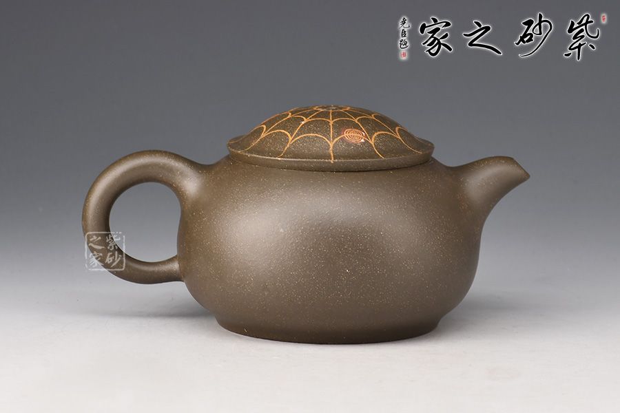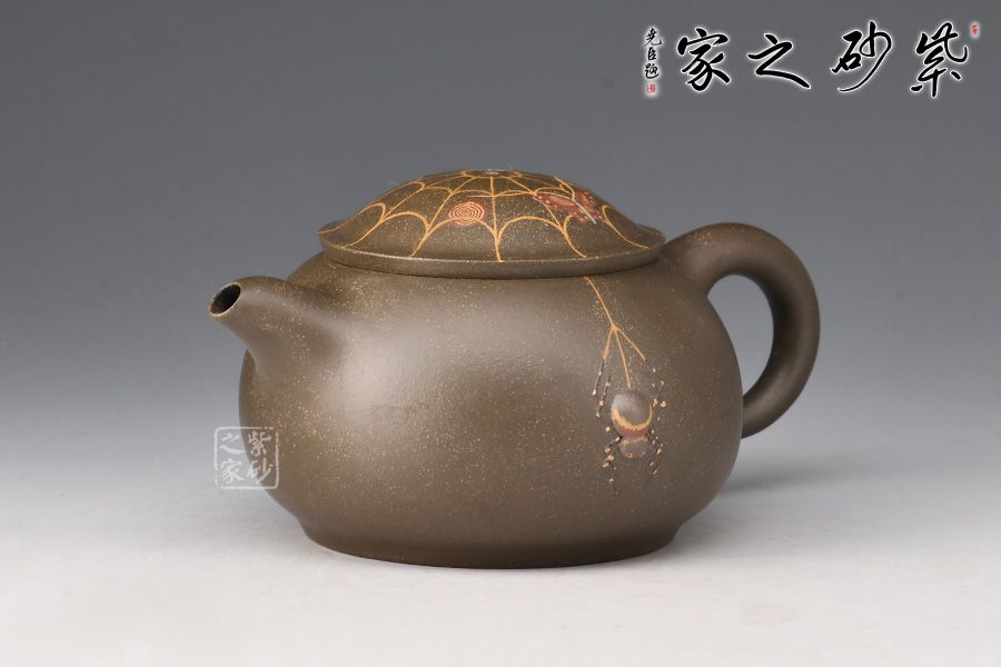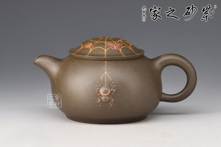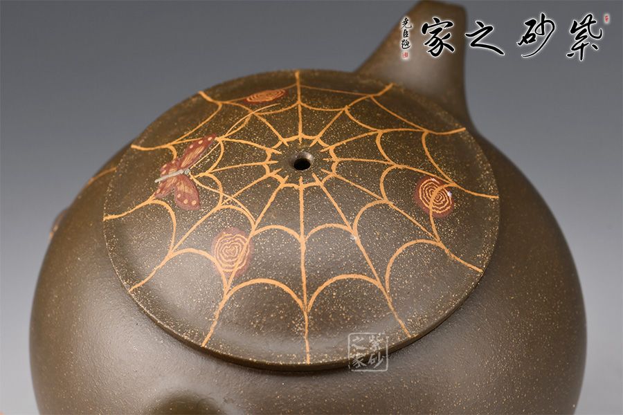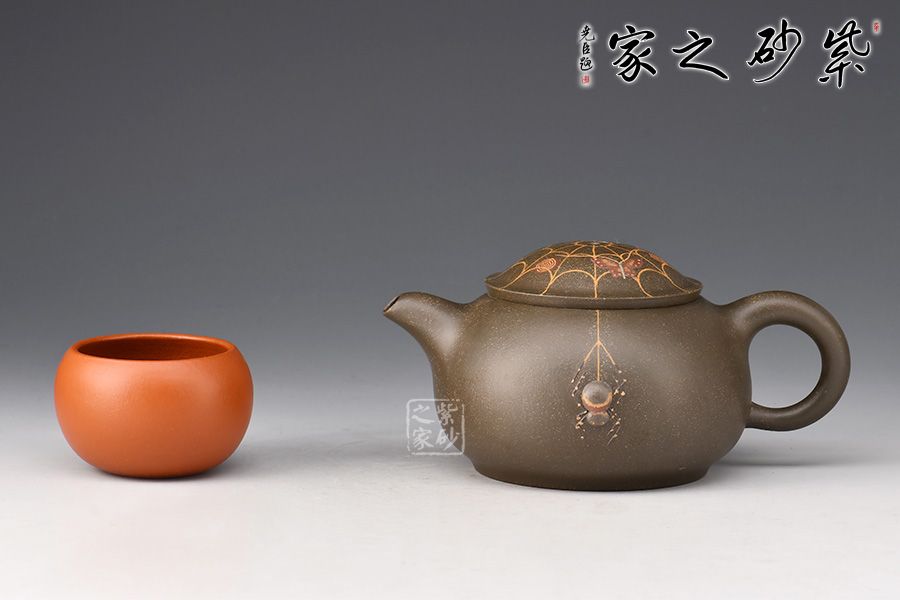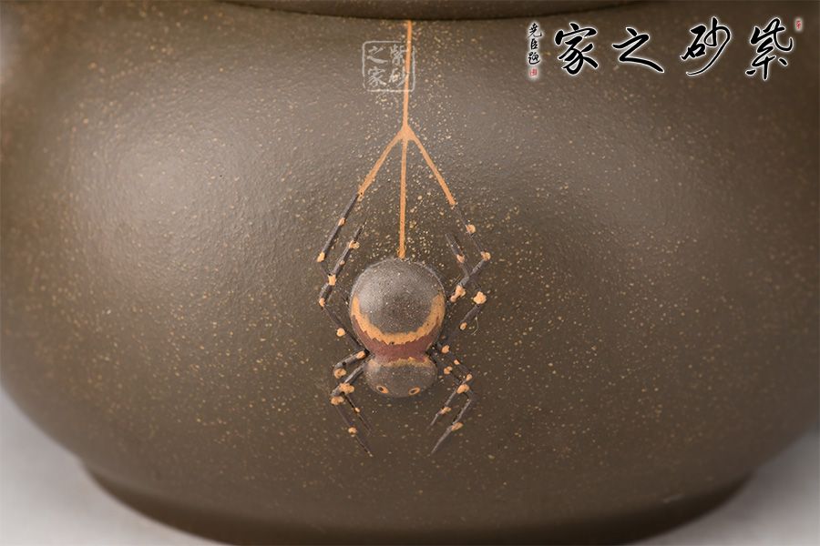 在民間故事中,蜘蛛脫網(wǎng)而出被看做是“喜從天降”的寓意,故而在杯托表面與壺蓋上繪出蜘蛛網(wǎng)的形態(tài),并塑蜘蛛,壺身雕塑蜘蛛,細節(jié)處理到位,十分精到。