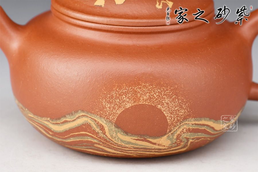 “旭日東升”系列壺設計巧妙,整體比例勻稱,線條流暢,并利用紫砂絞泥工藝的高超技法讓整幅畫面更加自然協(xié)調,象征一輪紅日冉冉升起,這樣的設計,起到了畫龍點睛的效果,也使得壺的主題思想更為突出。整器設計新穎,工藝精良,實用性強,值得入手。