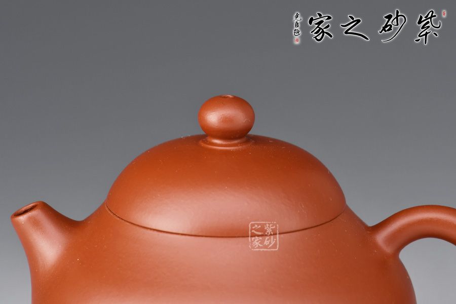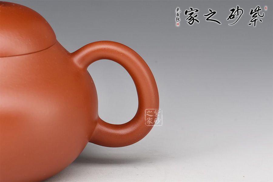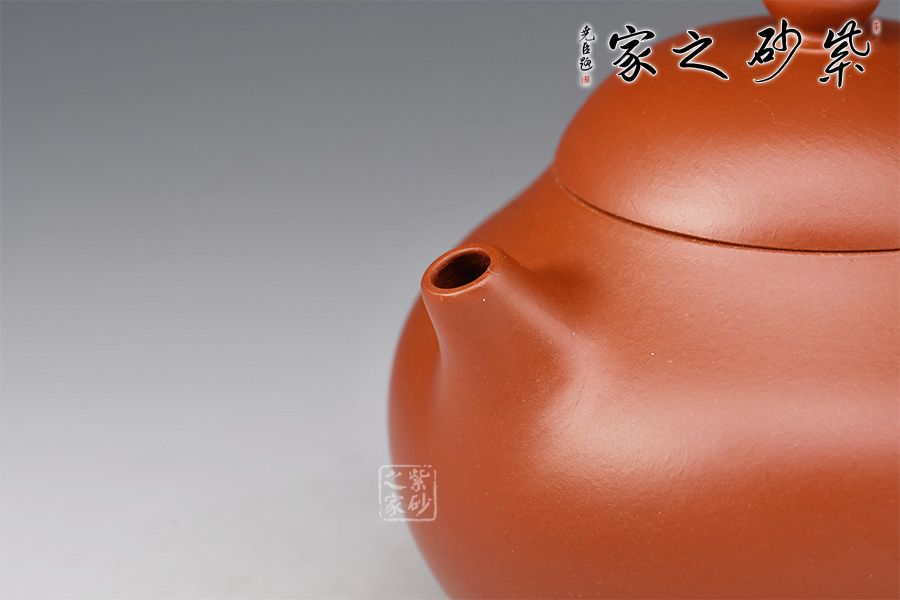 此壺為選用大紅袍精制而成,色澤溫潤,讓人愛不釋手。通體光素,壺身飽滿圓潤,截蓋與壺身銜接自然,渾然一體,寶珠鈕立于其上,小巧精致。直流嘴短小俊俏,出水爽利,倒耳把上斂下豐,端莊秀美。整壺氣韻通貫,于含蓄之中顯優(yōu)雅,210cc的容量非常適合把玩,手感極佳,易于泡養(yǎng),是一把極為實(shí)用的殺茶利器。