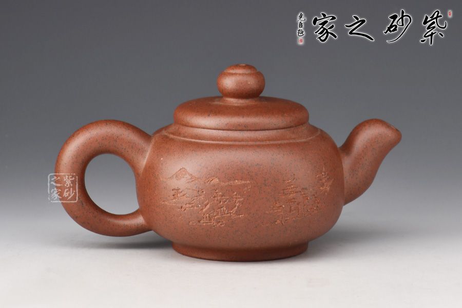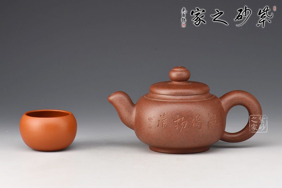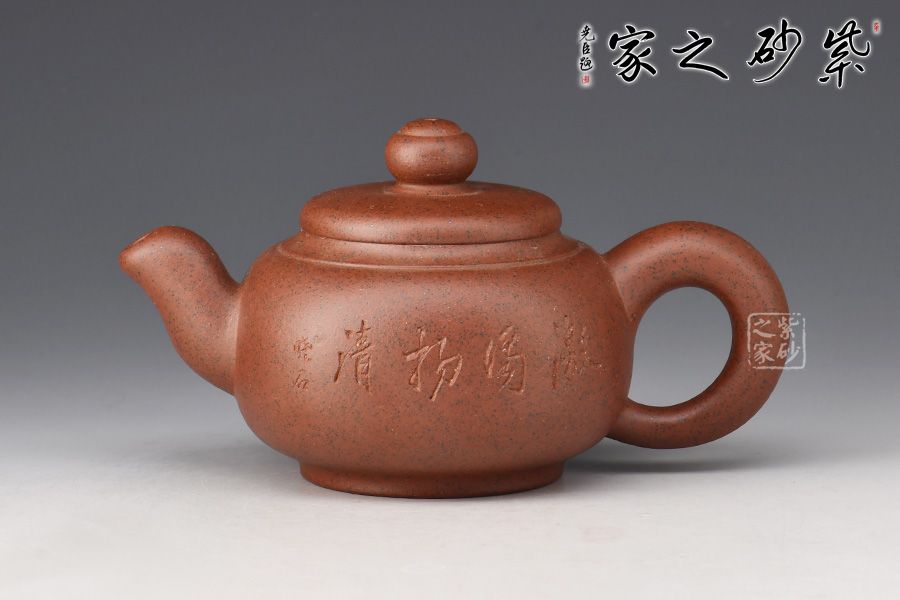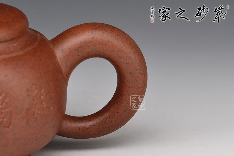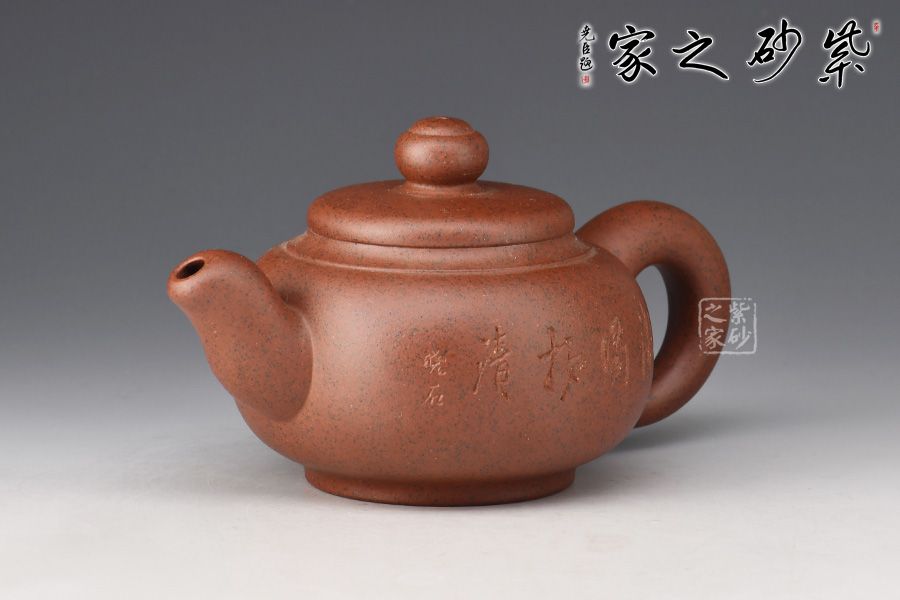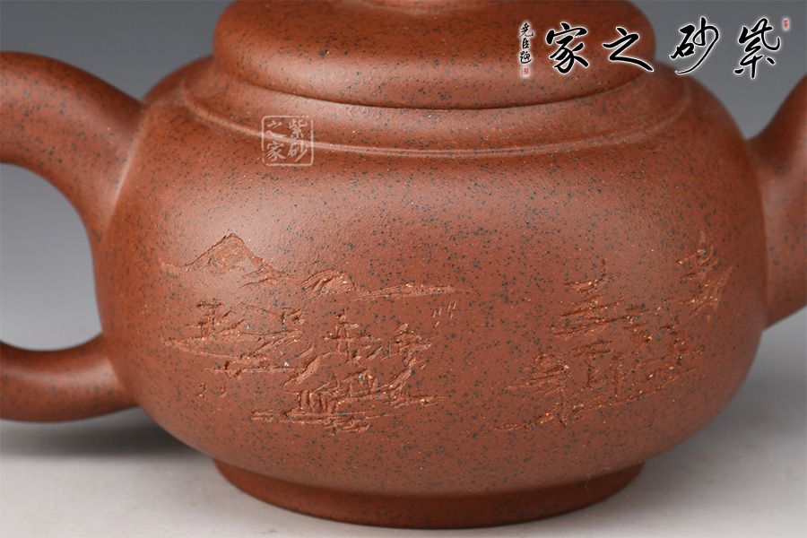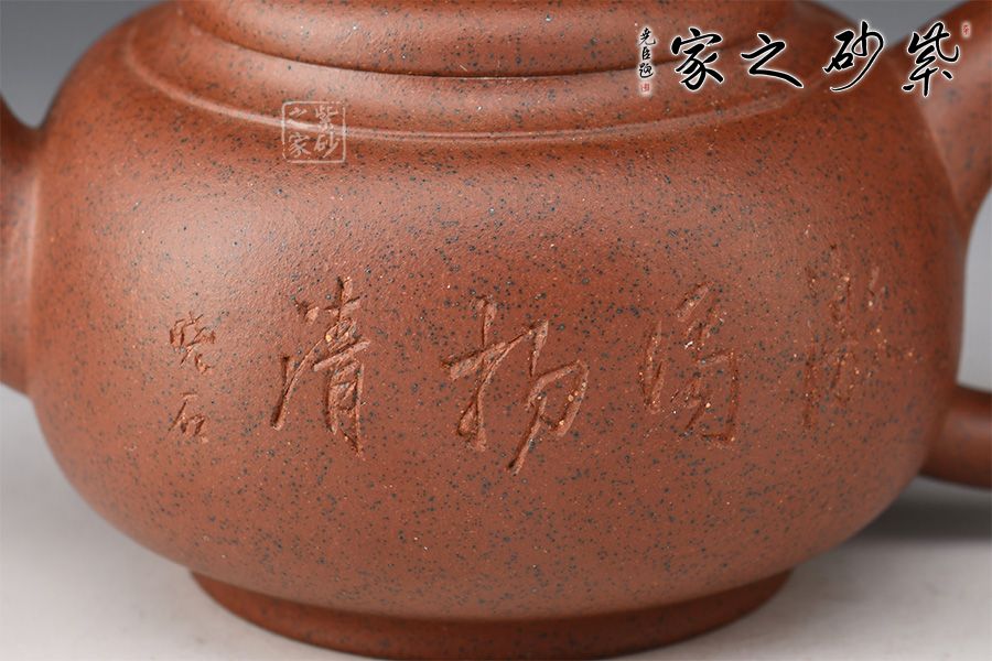 壺體沉穩(wěn)端莊,方中有圓,圓中有方。壓蓋設(shè)計(jì),壺蓋微微穹起,上有扁珠形壺鈕,整體觀之通融圓潤,實(shí)為案上陳列之佳器。壺身其兄許雙軍孤品刻繪,刀法利落,字型規(guī)整,意境悠遠(yuǎn),推薦收藏。