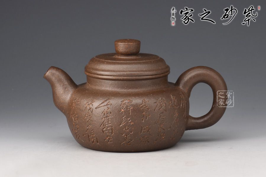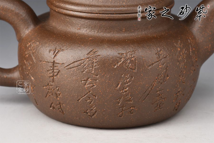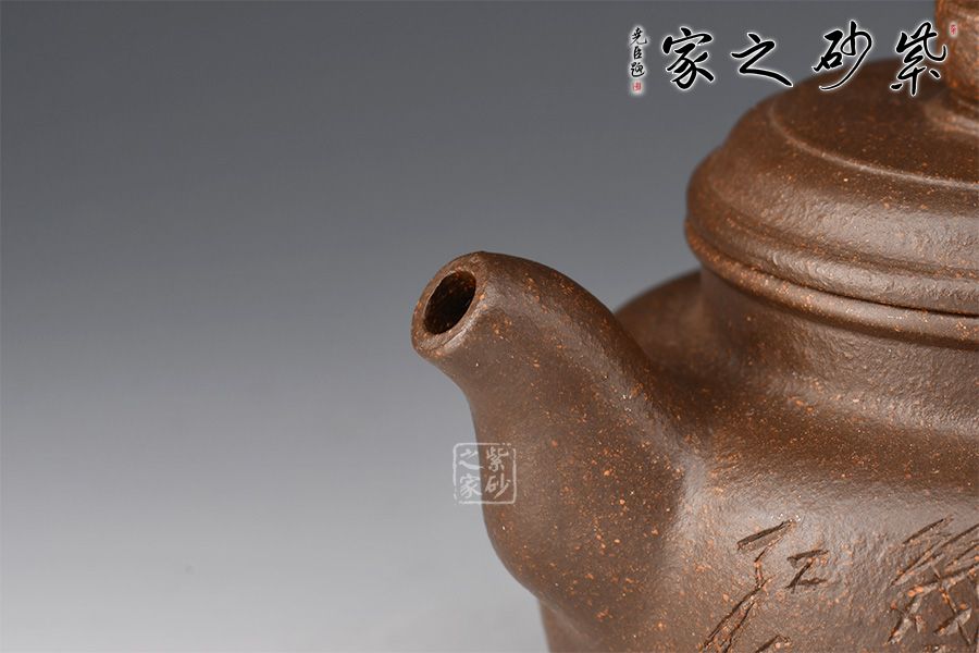 短短的圓柱形壺鈕,與壺身一致。壺蓋微微鼓起來,子母線咬合緊致,壺肩略微平整, 彎嘴挺出,出水爽利,同時圈把闊大,拿捏方便。許雙軍孤品刻繪,收藏力薦!