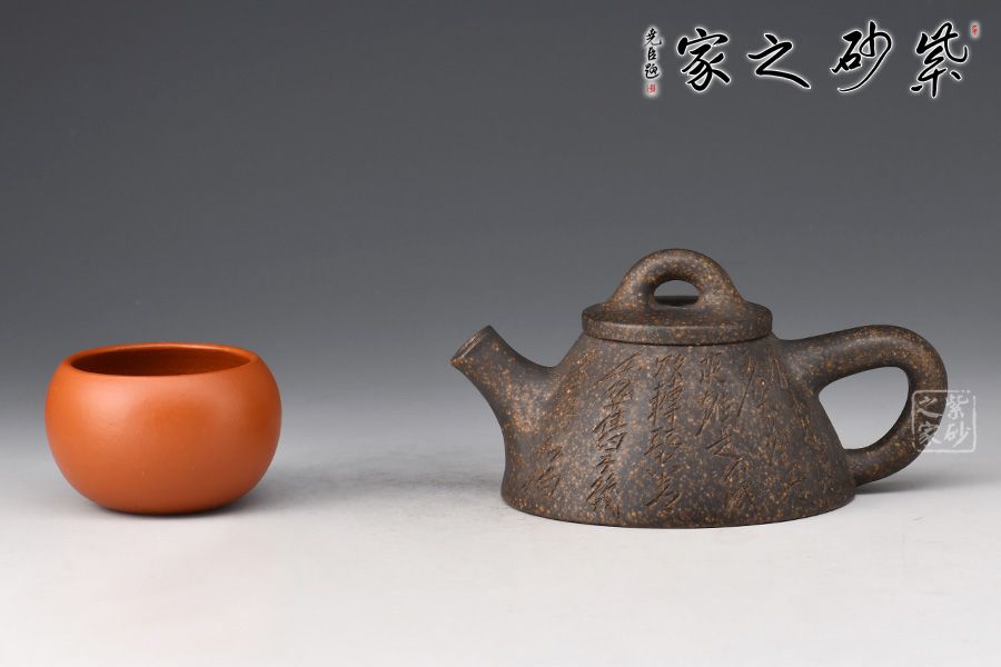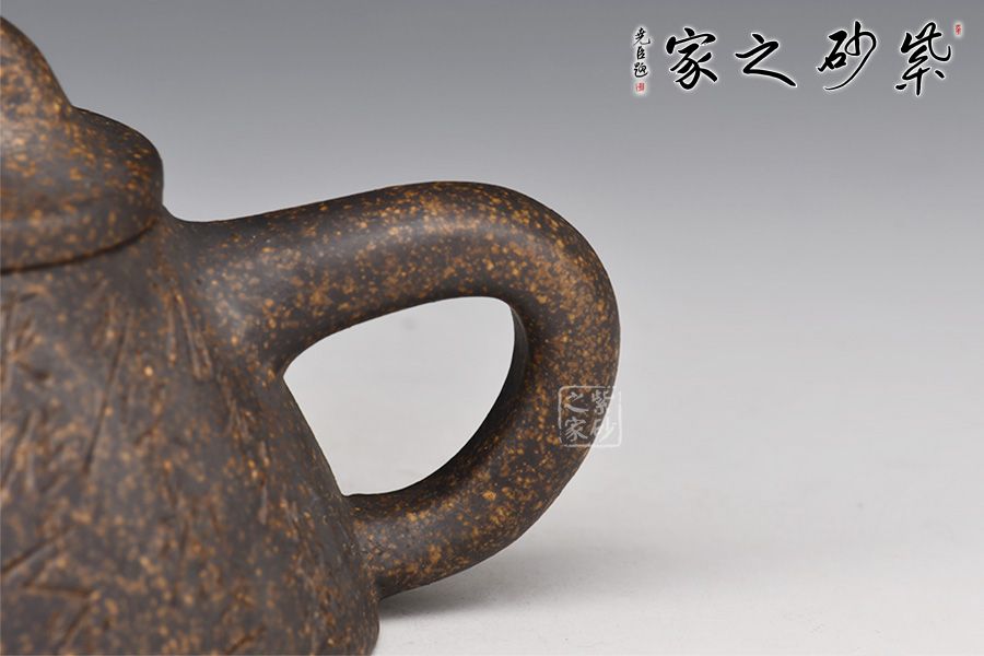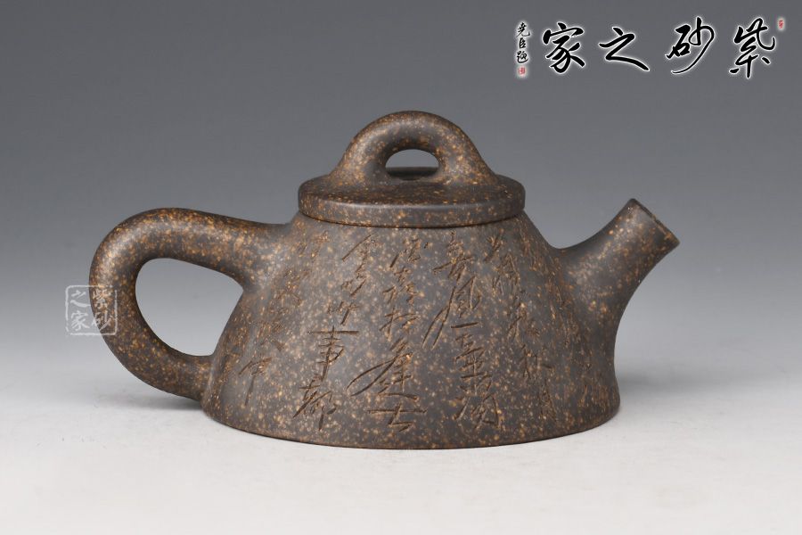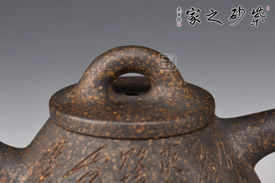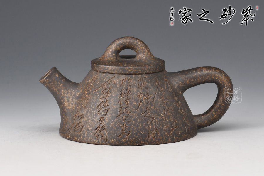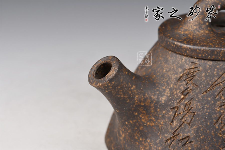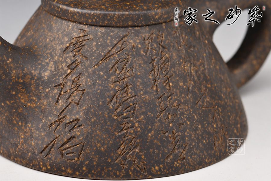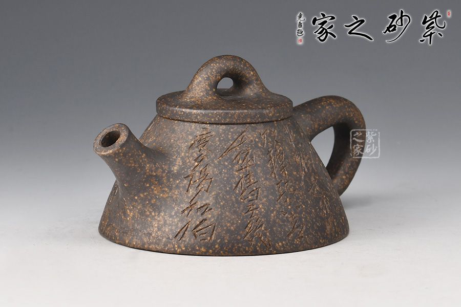 雖名為石瓢,但壺身與傳統(tǒng)石瓢截然不同。此壺壺身呈圓錐形,穩(wěn)實牢靠。壺嘴直流,簡潔順暢,倒三角把,簡練有力。厚實壓蓋,傳統(tǒng)橋型鈕,壺腹精致的單雙刀陶刻,刻畫出剛毅的詩詞,與壺身相得益彰,霸氣外露,收藏力薦!