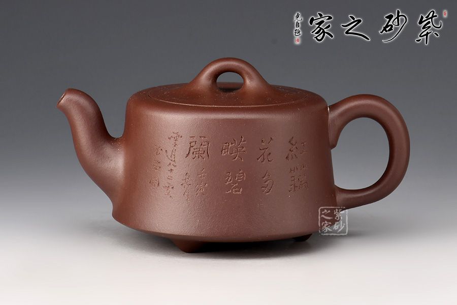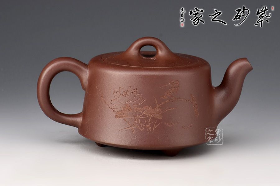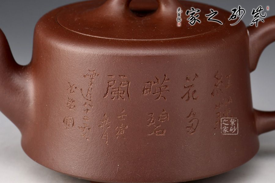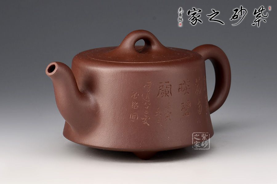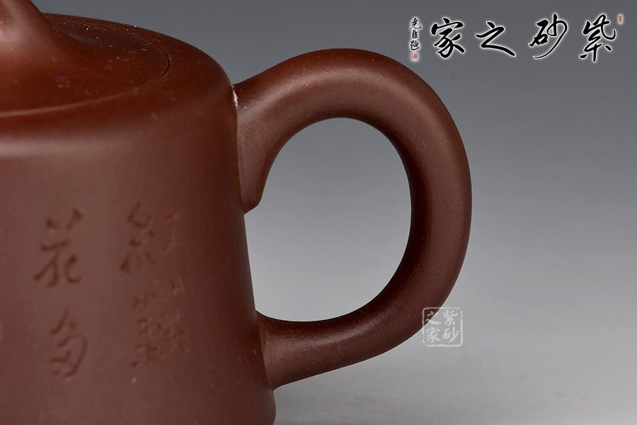 整款壺為柱形,上窄下寬,壺底三足,挺立壺身。二彎嘴線條流暢,出水爽利。耳把拿捏方便。橋形鈕,嵌蓋,氣密性極好。壺身其兄許雙軍孤品刻繪,推薦收藏。