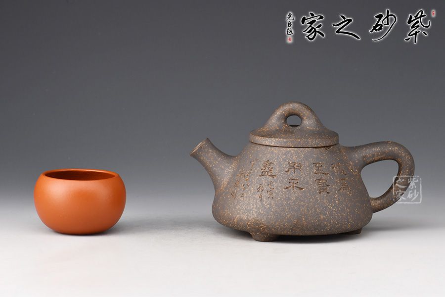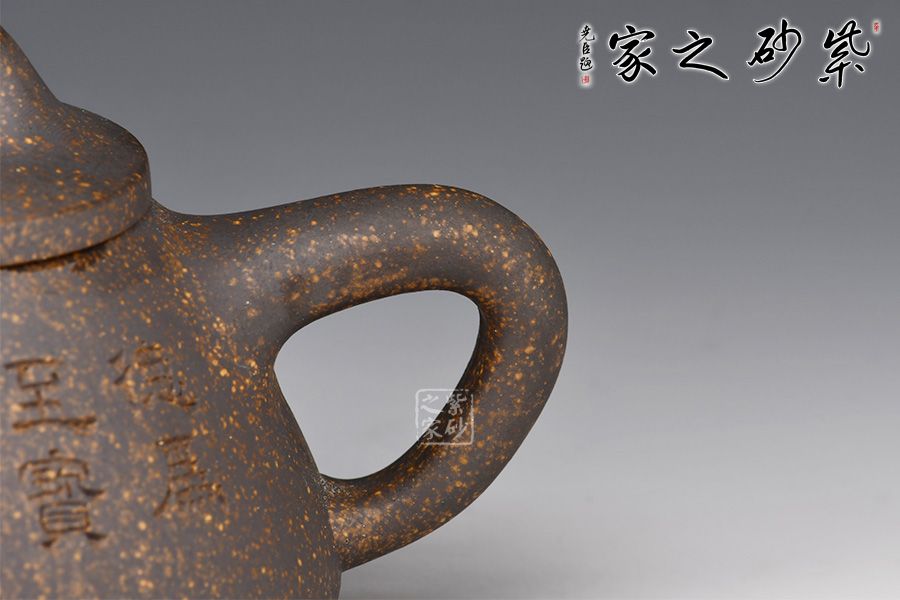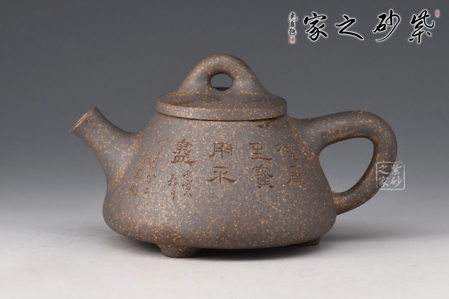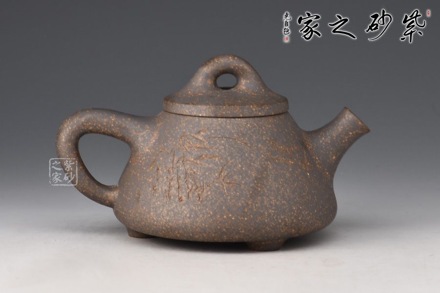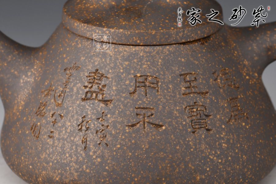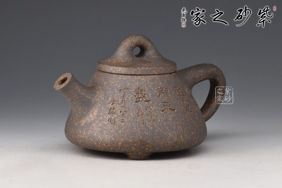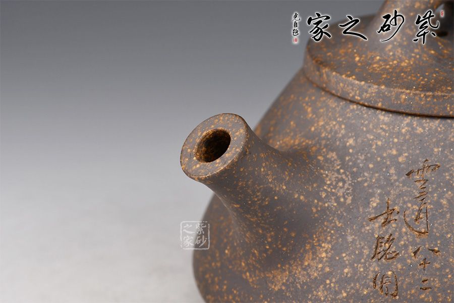 雖名為石瓢,但壺身與傳統(tǒng)石瓢截然不同。此壺壺身呈圓錐形,穩(wěn)實牢靠。壺嘴直流,簡潔順暢,倒三角把,簡練有力。厚實壓蓋,傳統(tǒng)橋型鈕,壺腹精致的單雙刀陶刻,刻畫出剛毅的詩詞,與壺身相得益彰,霸氣外露,收藏力薦!