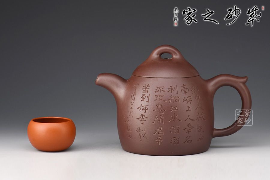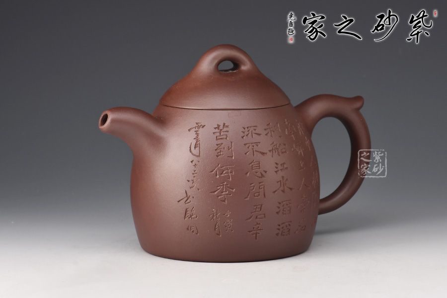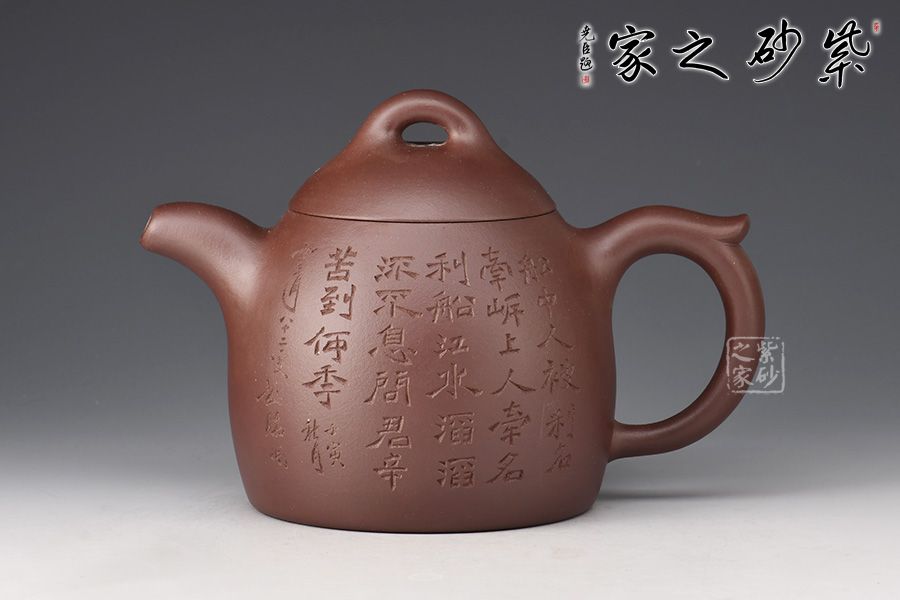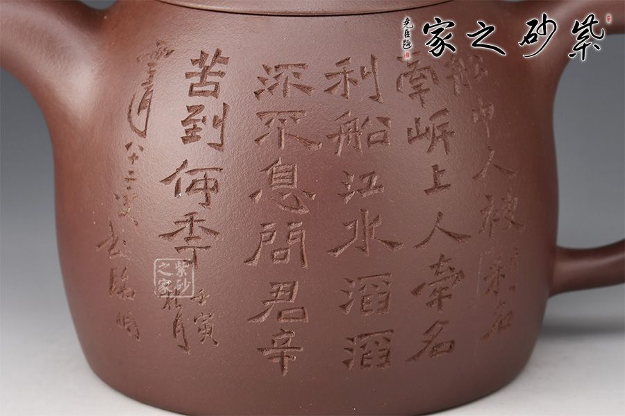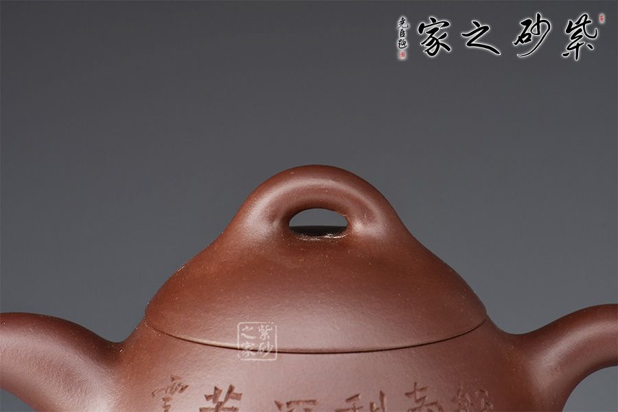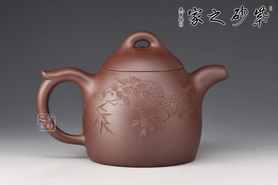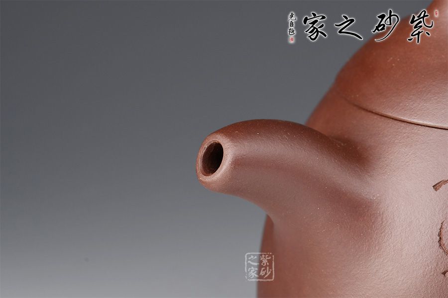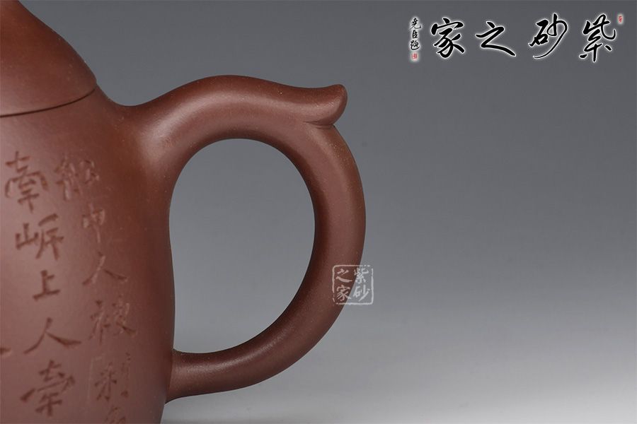 壺身若秤砣之形,高聳挺立,自下至上逐漸收斂,截蓋上下渾然一體,線條自然流暢。一彎流短而挺拔,出水爽利,環(huán)形飛把不矯不揚,儒雅端莊。壺身其兄許雙軍孤品刻繪,推薦收藏!
