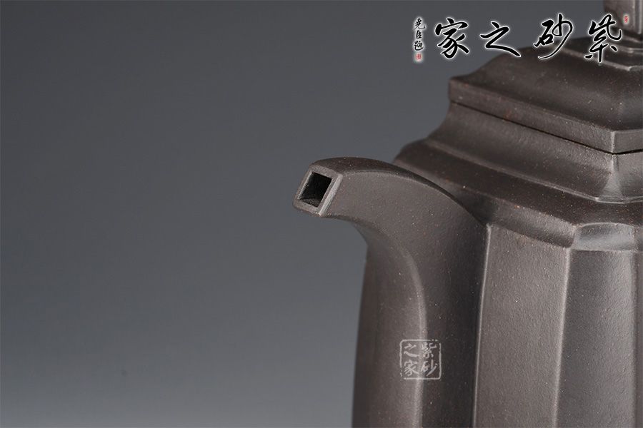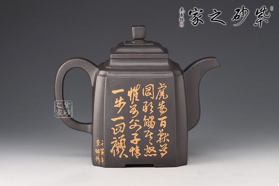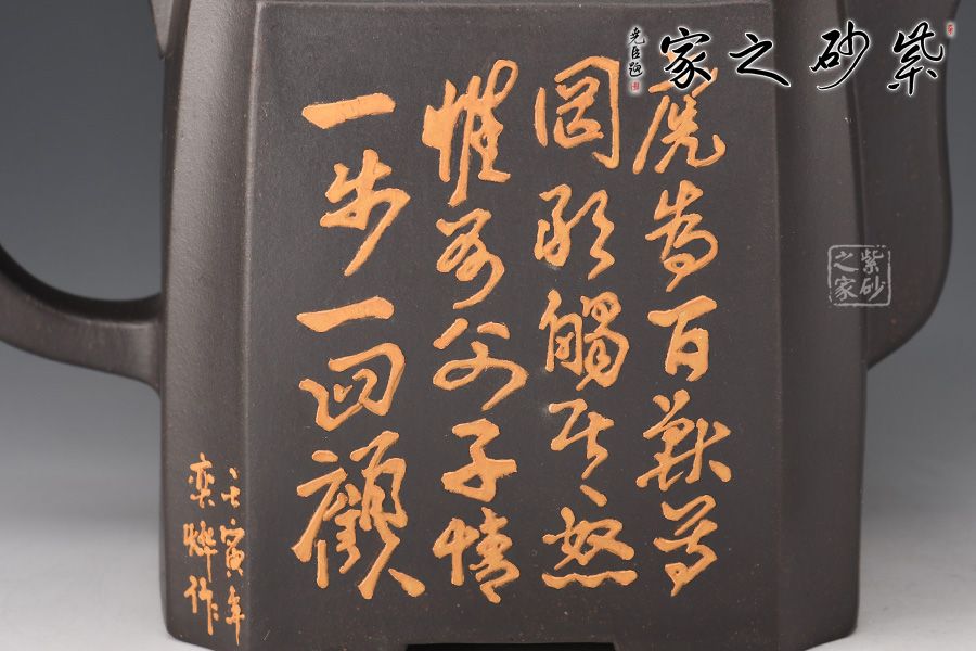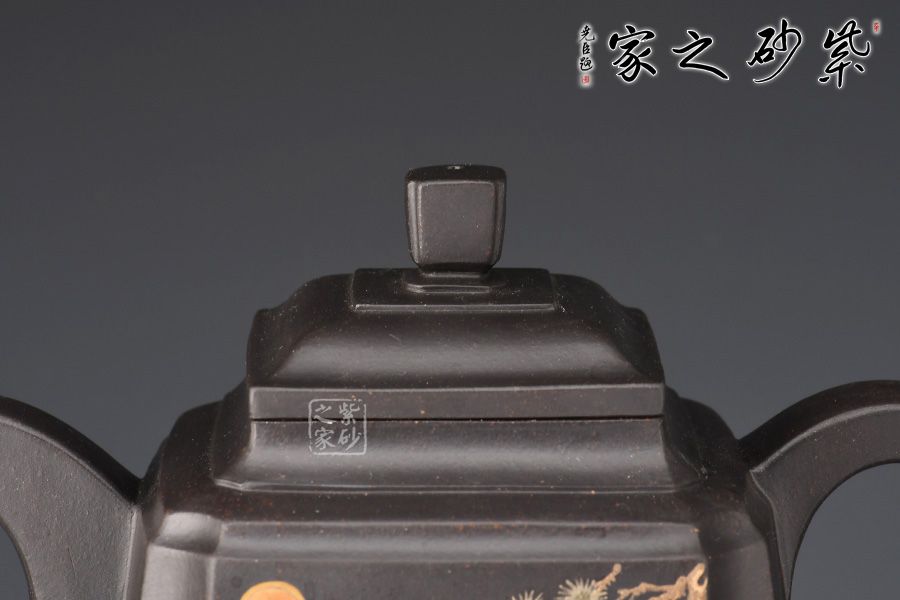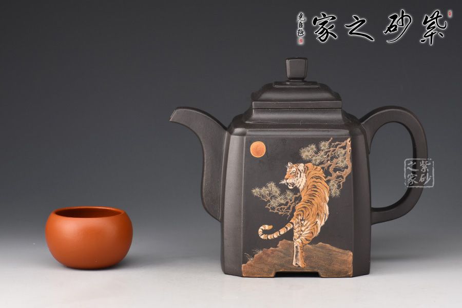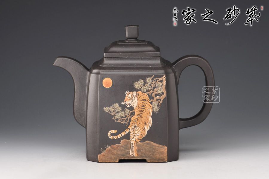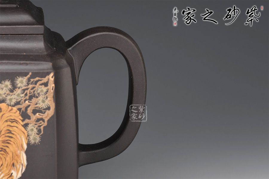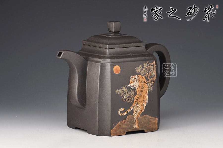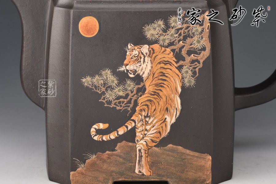 高四方壺,制作工藝非常難。此壺壺身兩面相交處,采用凹線手法藏鋒匿角,使轉(zhuǎn)角含蓄穩(wěn)重,壺身塊面清晰,觀其壺體,方口、方底、方流、方把,一氣呵成,飽滿扎實,三彎方嘴,四足底,氣韻融通,穩(wěn)重沉靜又不失玲瓏。壺身泥繪猛虎,霸氣十足。