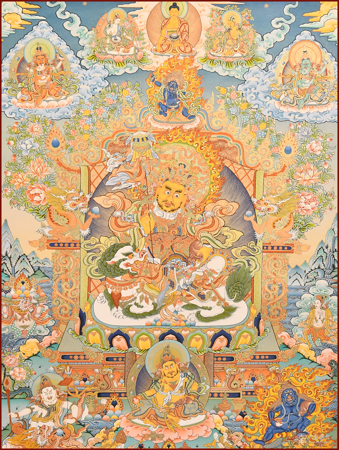 | 唐卡是歷史的瑰寶,現(xiàn)已被例入國家非物質(zhì)文化遺產(chǎn)名錄,得到了高度的重視和保護。同時由于顏料的珍稀、繪制周期長、工藝復(fù)雜大大增強了其珍藏價值。一幅好的作品可遇不可求,近年來唐卡已成為收藏界炙手可熱的藏品。 | 唐卡的形式便于攜帶,其內(nèi)容體現(xiàn)了藏傳佛教的莊重、神圣、華貴,被稱為“移動的佛像”。同時也是修行者積累善業(yè),追尋心靈的平靜與安寧的一個過程。 | 唐卡的內(nèi)容包羅萬象,它以圖像的方式承載著藏族文化精髓,是藏族智慧的結(jié)晶,廣泛傳播了藏地的文化、歷史和宗教理論。 | 唐卡絢麗的色彩、流暢的線條、嚴(yán)謹(jǐn)?shù)慕Y(jié)構(gòu),都充滿著濃郁的高原和游牧民族風(fēng)情,無疑是難得的藝術(shù)珍品。值得一提的是唐卡繪制顏料全部為天然礦物顏料,畫面效果艷麗,可以保存千年而不變色。 |