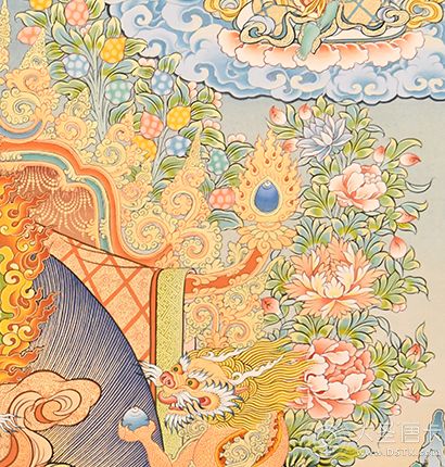 該作品在表現(xiàn)形式及構(gòu)圖和設(shè)色上吸收了漢地工筆畫的畫風(fēng),與藏傳繪畫藝術(shù)兼容并蓄,在傳統(tǒng)上加進自己對繪畫和佛教的理解來創(chuàng)作,意境遼遠。線條的繪制手法精湛,細致而不纖弱,流暢舒緩。