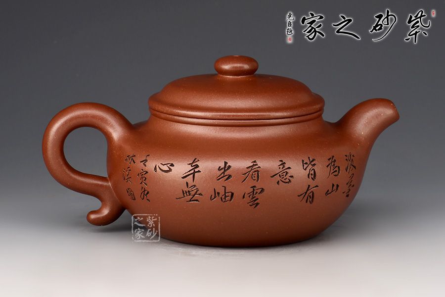 此為經(jīng)典器型仿古壺,呈扁圓筒型,身扁、腹鼓、頸高,一彎流配以飛把,比例恰到好處,微鼓蓋上一寶珠鈕,口蓋敞闊,便于清洗,原礦底槽青作胎,泥色古樸,未養(yǎng)先潤,泡養(yǎng)性佳。