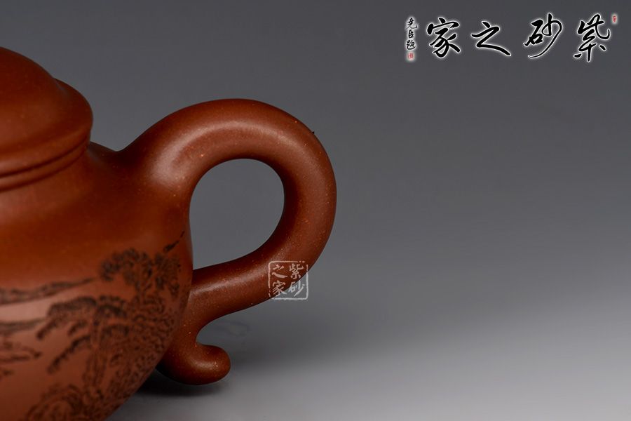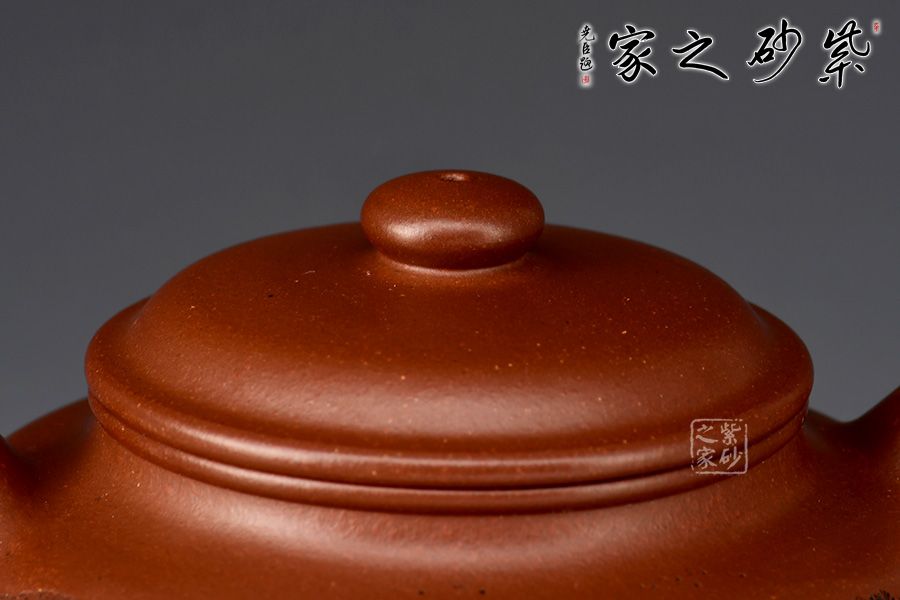 整體造型似鈕、蓋、身以三個橢圓形壘疊,整壺上下收斂,中間鼓起,渾圓敦實(shí),柔態(tài)畢現(xiàn),原礦紅皮龍作胎,制作難度高,壺面溫潤如玉石。此壺神態(tài)俊美,切琢無疵,給人端莊秀麗之感。