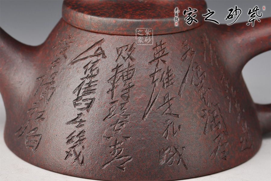 雖名為石瓢,但壺身與傳統(tǒng)石瓢截然不同。此壺壺身呈圓錐形,穩(wěn)實(shí)牢靠。壺嘴直流,簡(jiǎn)潔順暢,倒三角把,簡(jiǎn)練有力。厚實(shí)壓蓋,傳統(tǒng)橋型鈕,壺腹精致的單雙刀陶刻,刻畫出剛毅的詩(shī)詞,與壺身相得益彰,霸氣外露,收藏力薦!