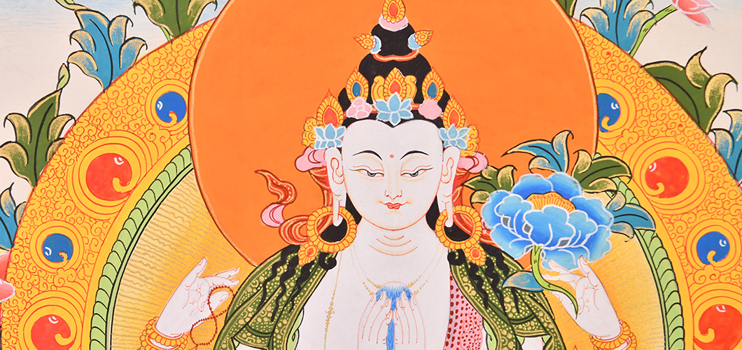四臂觀音是雪域西藏的守護神,藏人由老至幼家家戶戶,皆吟誦其六字大明咒:“嗡嘛呢叭咪吽”。四臂觀音與文殊菩薩、金剛手菩薩,合稱三族姓尊,代表大悲、大智、大力,為密乘行者人人必修的法門。