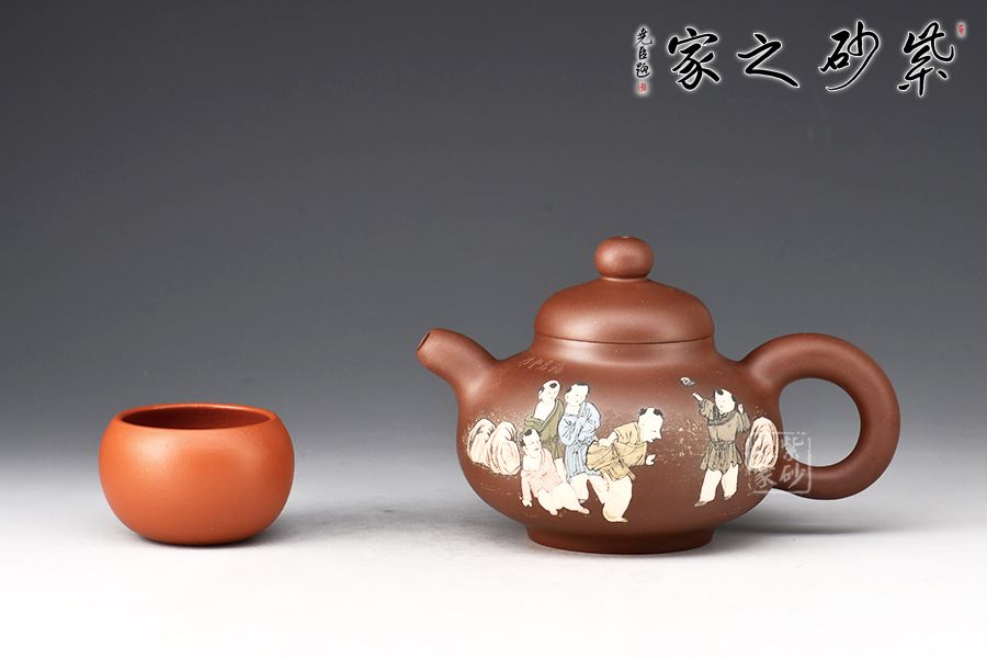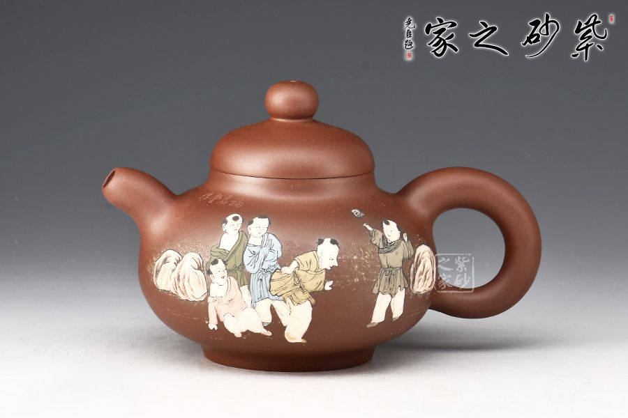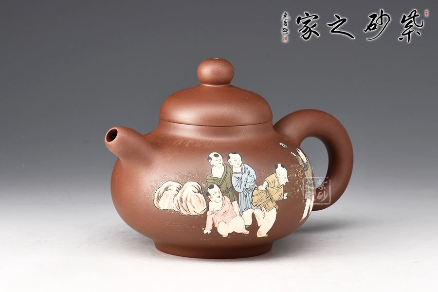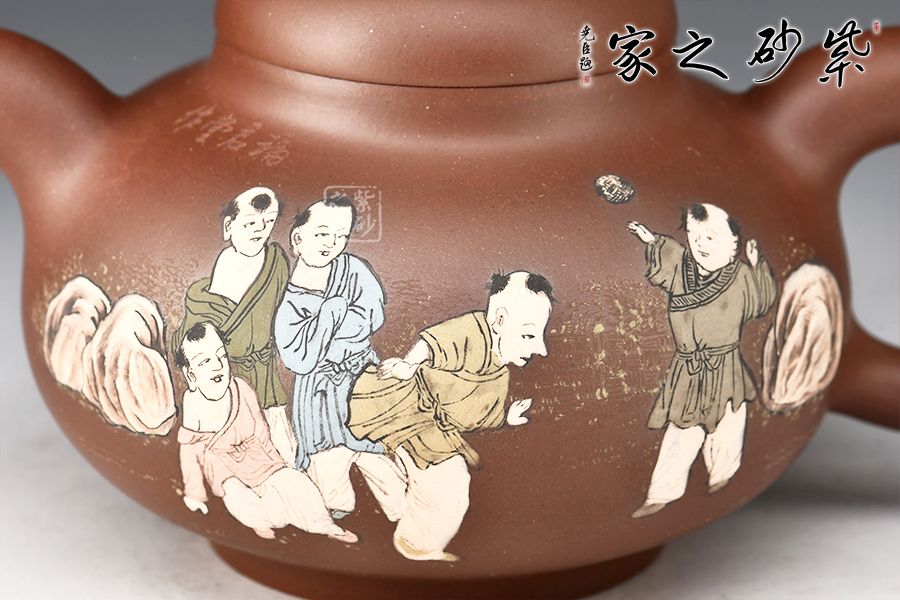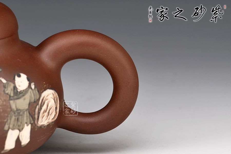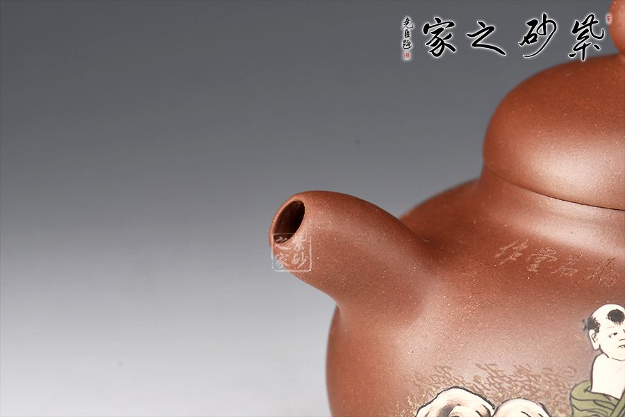 壺身由其子王志明(天樂(lè))刻繪裝飾,正面陶刻童子圖,趣味十足,反面陶刻詩(shī)詞。整器氣韻生動(dòng),內(nèi)蘊(yùn)十足,上手舒適,成色佳,易泡養(yǎng),是一把賞用俱佳的文人壺佳作。