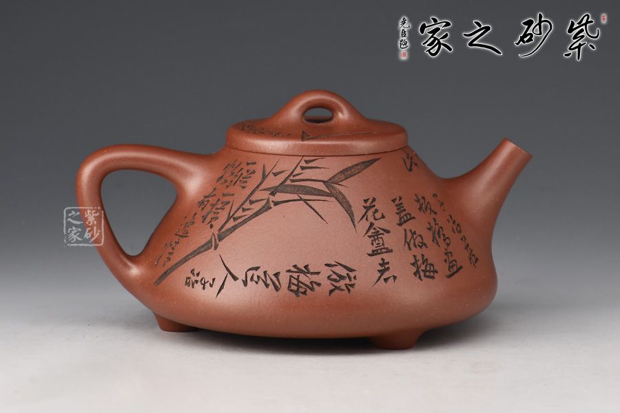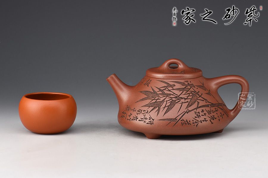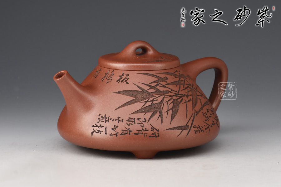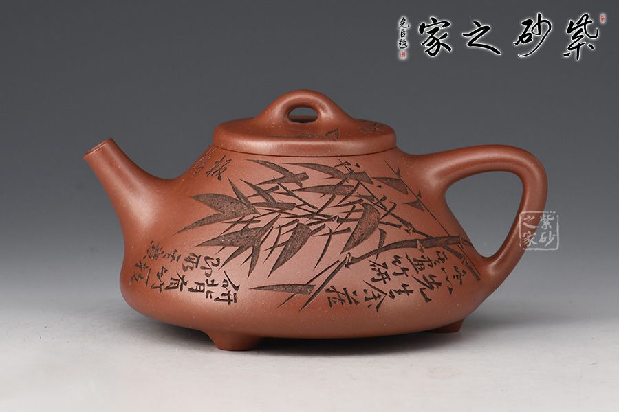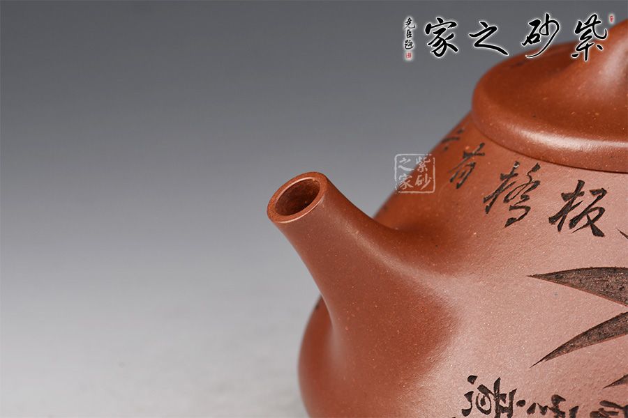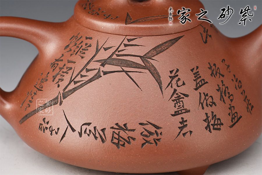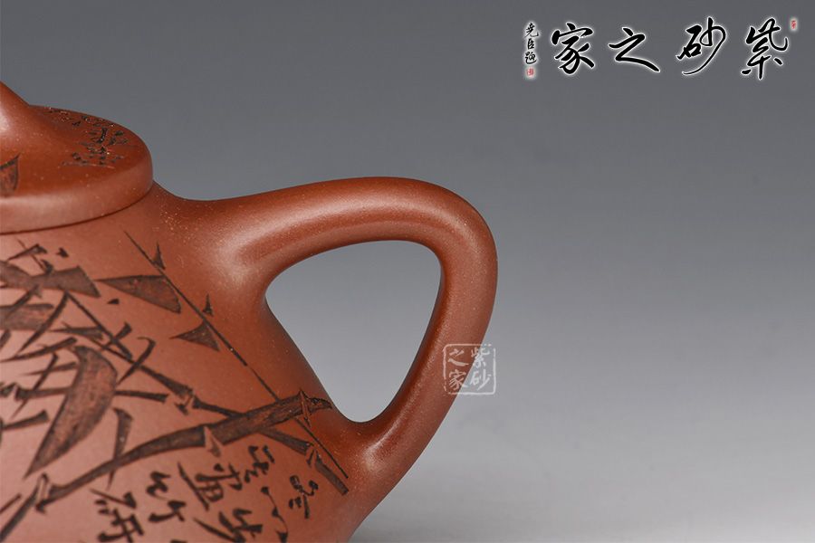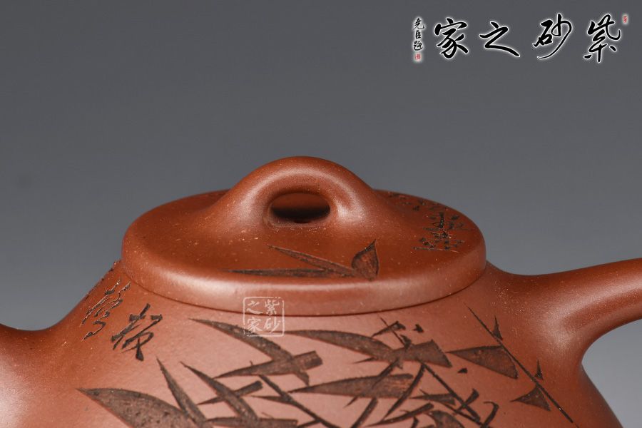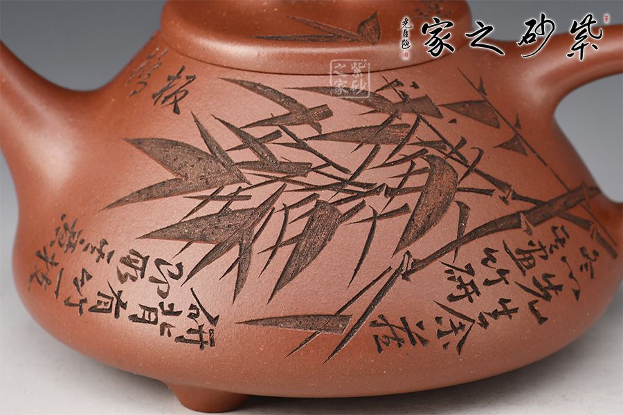 壺身陶刻竹子,俯視壺身,壺蓋竹之枝葉與壺身相呼應(yīng)。整壺融書畫、陶刻于一體,是一把使用、賞玩皆宜的文人壺作品,值得收藏。