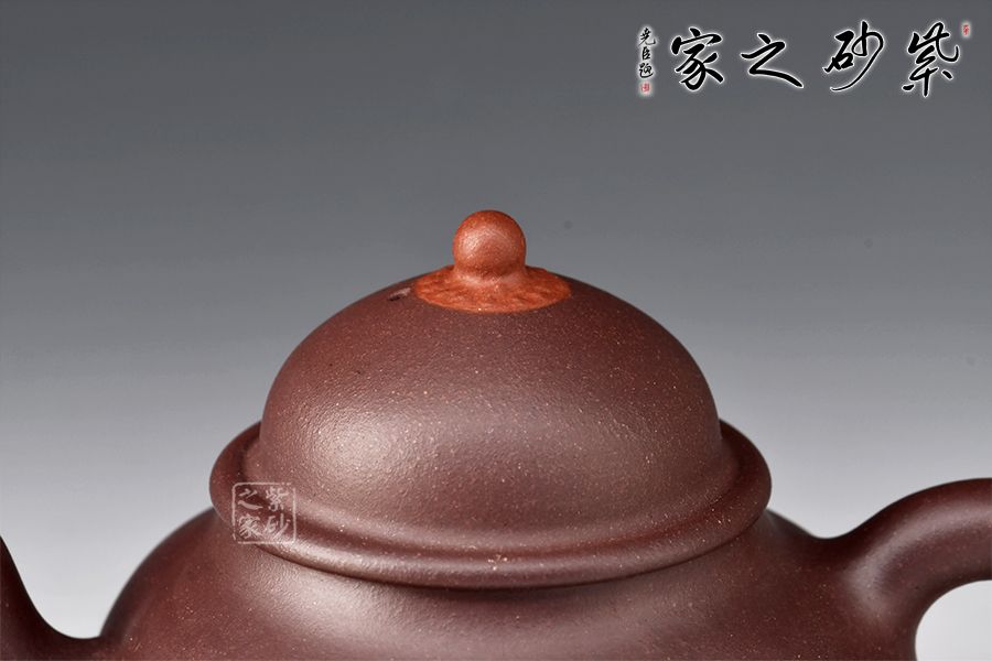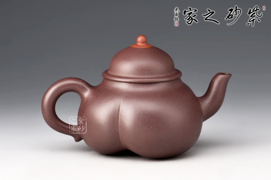 壺身渾圓飽滿,帶勾線,聚于壺底;蓋以高拱半圓為形,以工筆式的細(xì)膩呈現(xiàn)出女性乳房的形狀,渾圓飽滿,其上作一紅色乳頭為壺鈕,壺身更是圓潤(rùn)豐滿,借助紫砂傳統(tǒng)筋紋器的手法,寫意式地呈現(xiàn)出女性豐腴的臀部,線、面的變化在似與非似之間,卻又極富彈性之美。整器猶如一女子豐滿身形,含蓄優(yōu)雅,故名為“貴妃出浴壺”,名副其實(shí)也。