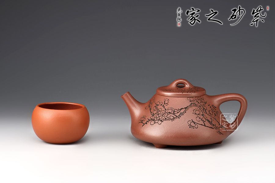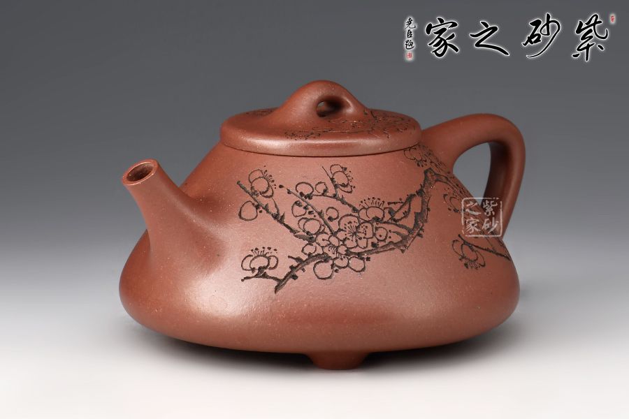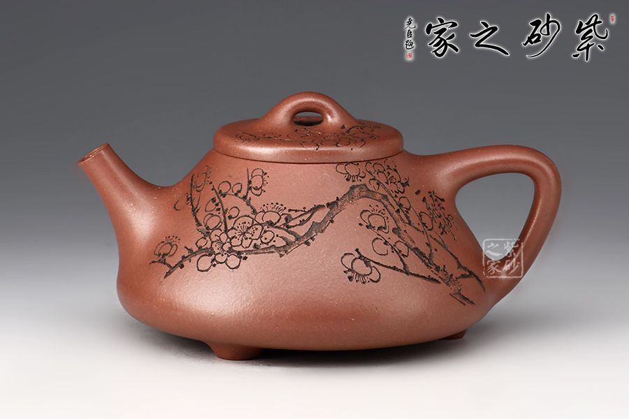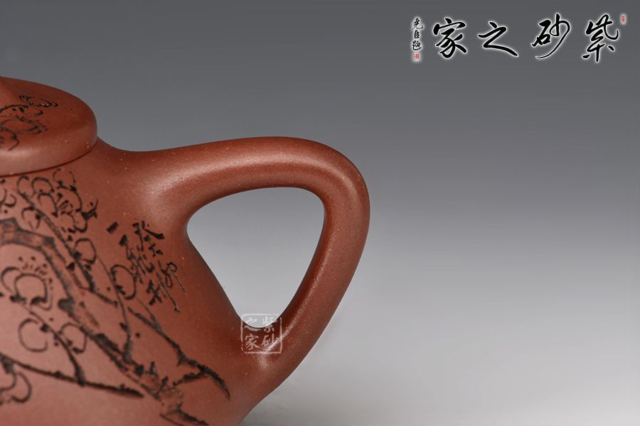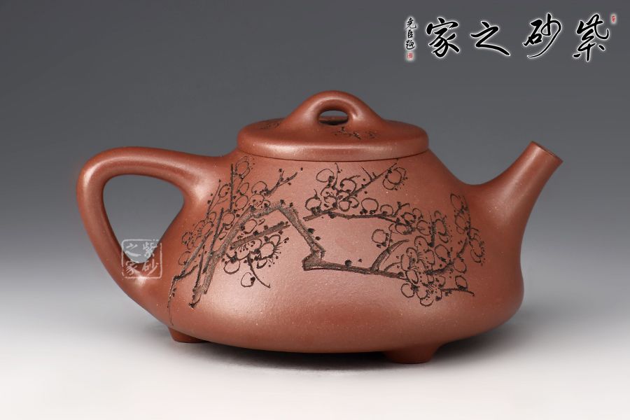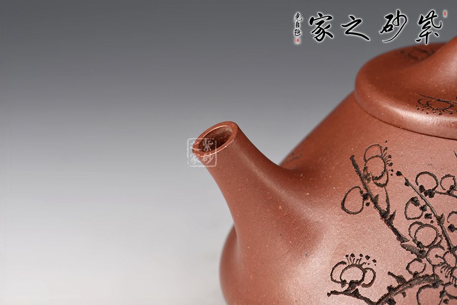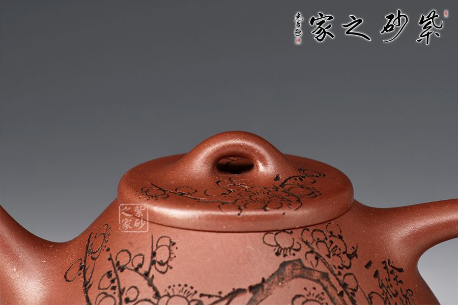 壺體陶刻裝飾,壺身陶刻恣意生長的梅枝,梅花延伸至壺蓋、彰顯著蓬勃旺盛的生命力。此壺造型簡潔,容量實(shí)用,必是一款沖茶利器,薦藏。