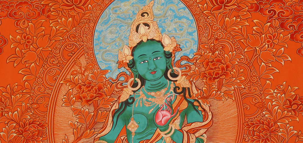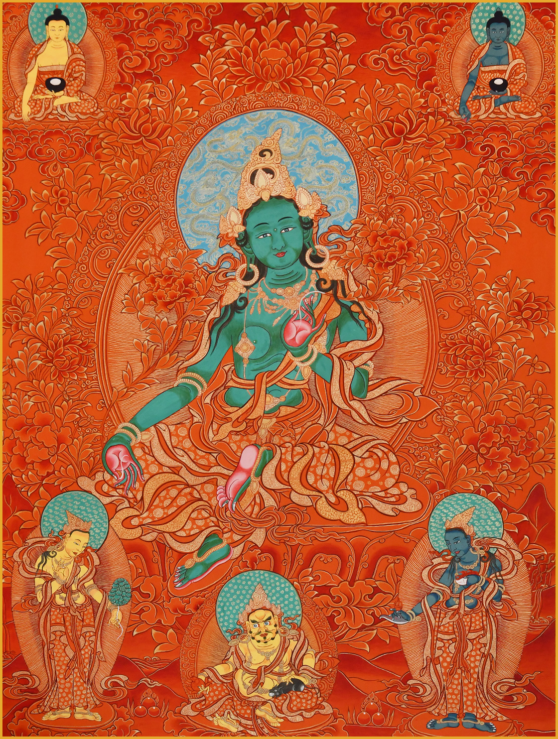 綠度母,藏語(yǔ)叫“卓姜”,是從觀音菩薩的眼淚中化現(xiàn)出來(lái)的,所以最慈悲。綠度母為所有度母之主尊,總攝其余二十尊化身之所有功德。因其救度之迅速、摧滅魔業(yè)之勇猛,故又稱(chēng)作“救度速勇母”。