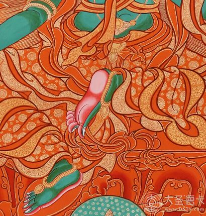 在繪制佛像服飾等位置時(shí),用刻金技法,使圖案更具豐富的層次和立體感,用金勾勒的線條和圖案不但明亮度進(jìn)一步提高,讓畫(huà)面更加燦爛,而且也使金在畫(huà)面上保持得更加長(zhǎng)久。