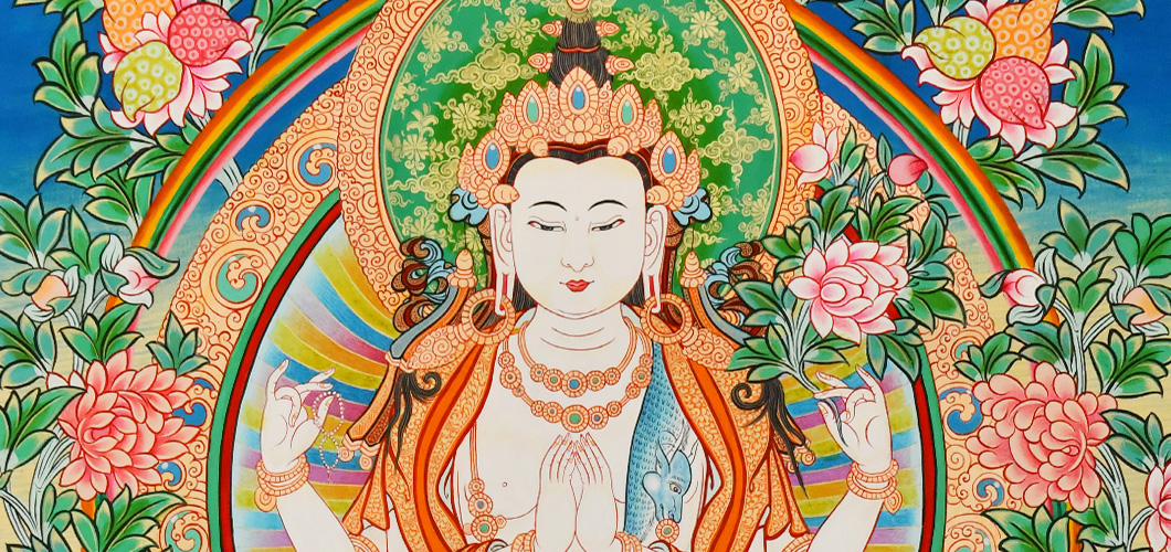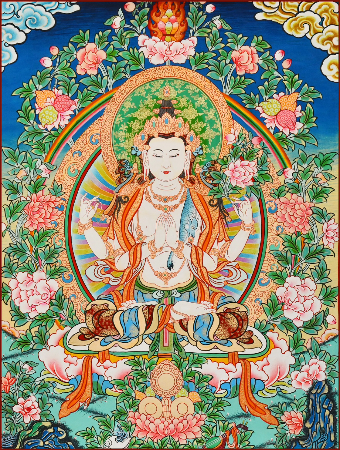 四臂觀音,雪域西藏的守護神,為西藏佛教密宗本尊之一。本尊身顏潔白如月,頭戴五佛冠,發黑色結髻,中央二手合掌於胸前,捧有摩尼寶珠,右手持水晶念珠。左手拈八瓣蓮花與耳際齊,面貌寂靜含笑。