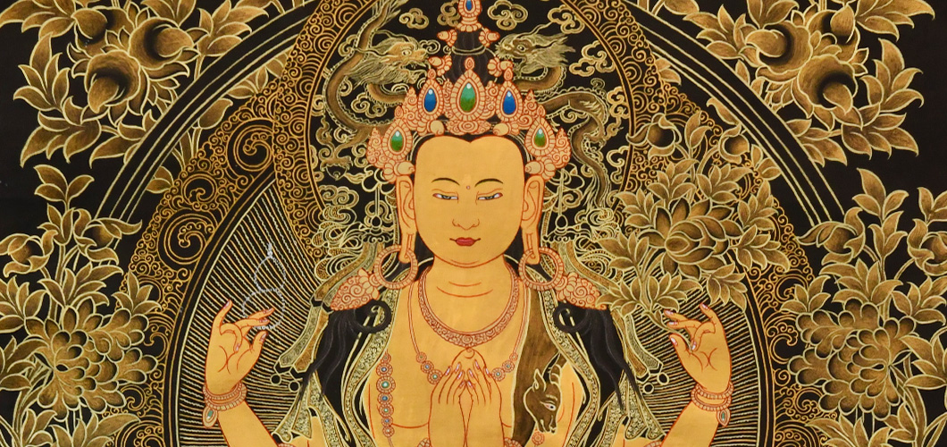 四臂觀音,雪域西藏的守護神,為西藏佛教密宗本尊之一。本尊身顏潔白如月,頭戴五佛冠,發(fā)黑色結髻,中央二手合掌於胸前,捧有摩尼寶珠,右手持水晶念珠。左手拈八瓣蓮花與耳際齊,面貌寂靜含笑。