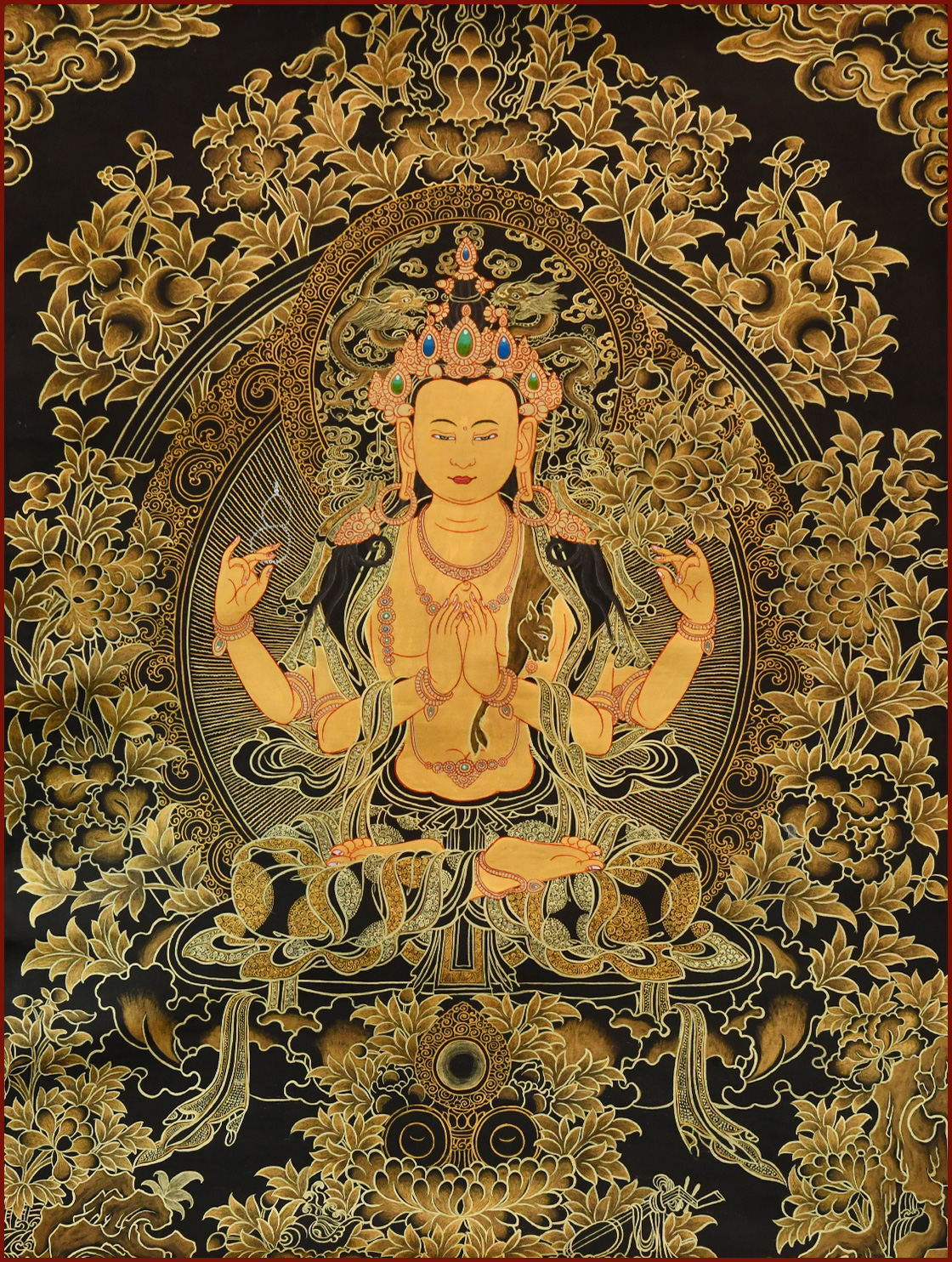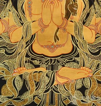 產(chǎn)地:熱貢 工藝:黑金 創(chuàng)作年份:2022 題材:四臂觀音 繪制時間:0日 尺寸:*45cm 裝裱: 材質: 使用場地: