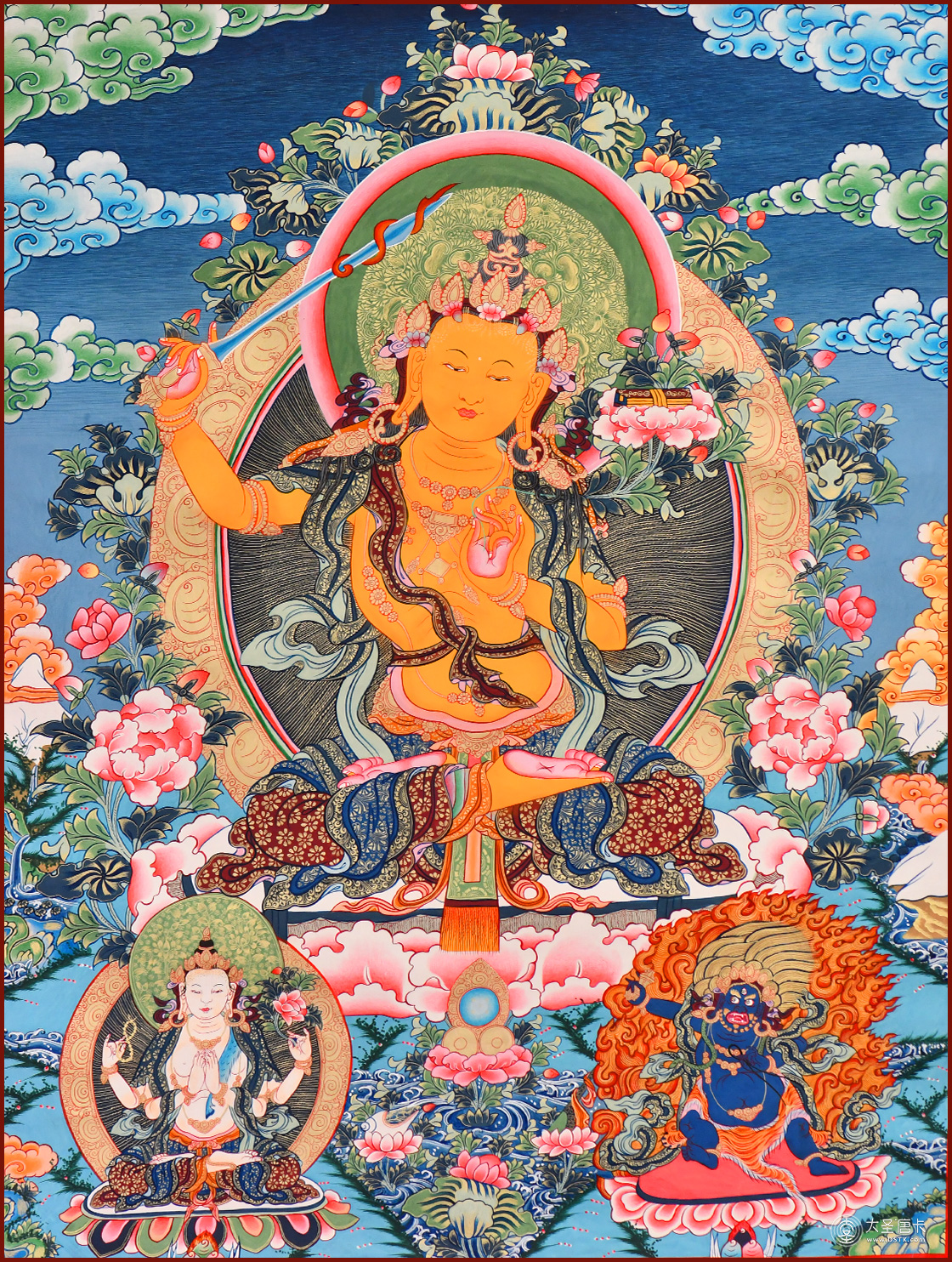 文殊菩薩為諸佛、諸菩薩之師,是大智慧的象征,智慧無雙,有開悟明智的加持力。通常手持慧劍,騎乘獅子,比喻以智慧利劍斬斷煩惱,以獅吼威風震懾魔怨。
