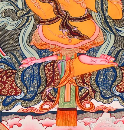 | 唐卡“師傅”開臉,筆路穩重流暢。體現完美天人相,可見佛菩薩慈眉善目,賦予唐卡畫像生的靈氣。 | 細節決定品質,點睛之筆不到位影響整體美觀,五官比例不協調,面目呆板,缺乏靈氣。 |