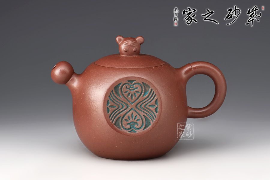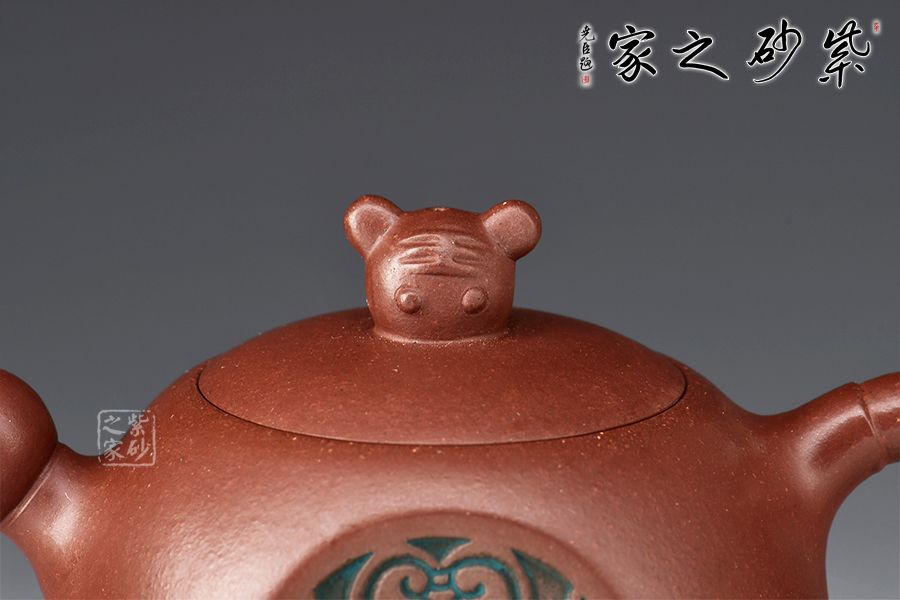 壺體為圓球形,壺嘴圓珠形,形似抽象的虎爪,壺把為抽象的壺尾巴,壺鈕為小老虎,虎體正反面都有一個圓形凹面,飾以抽象如意山水圖,一、代表抽象的虎皮紋,二、代表小虎肚子餓了需要吃東西(當然要喝茶水)。整體設(shè)計為:圓圓的身體,圓圓的肚子,圓圓的嘴,圓圓的尾,耳朵兩圓豎頭頂,六圓六順賀肖寅。
