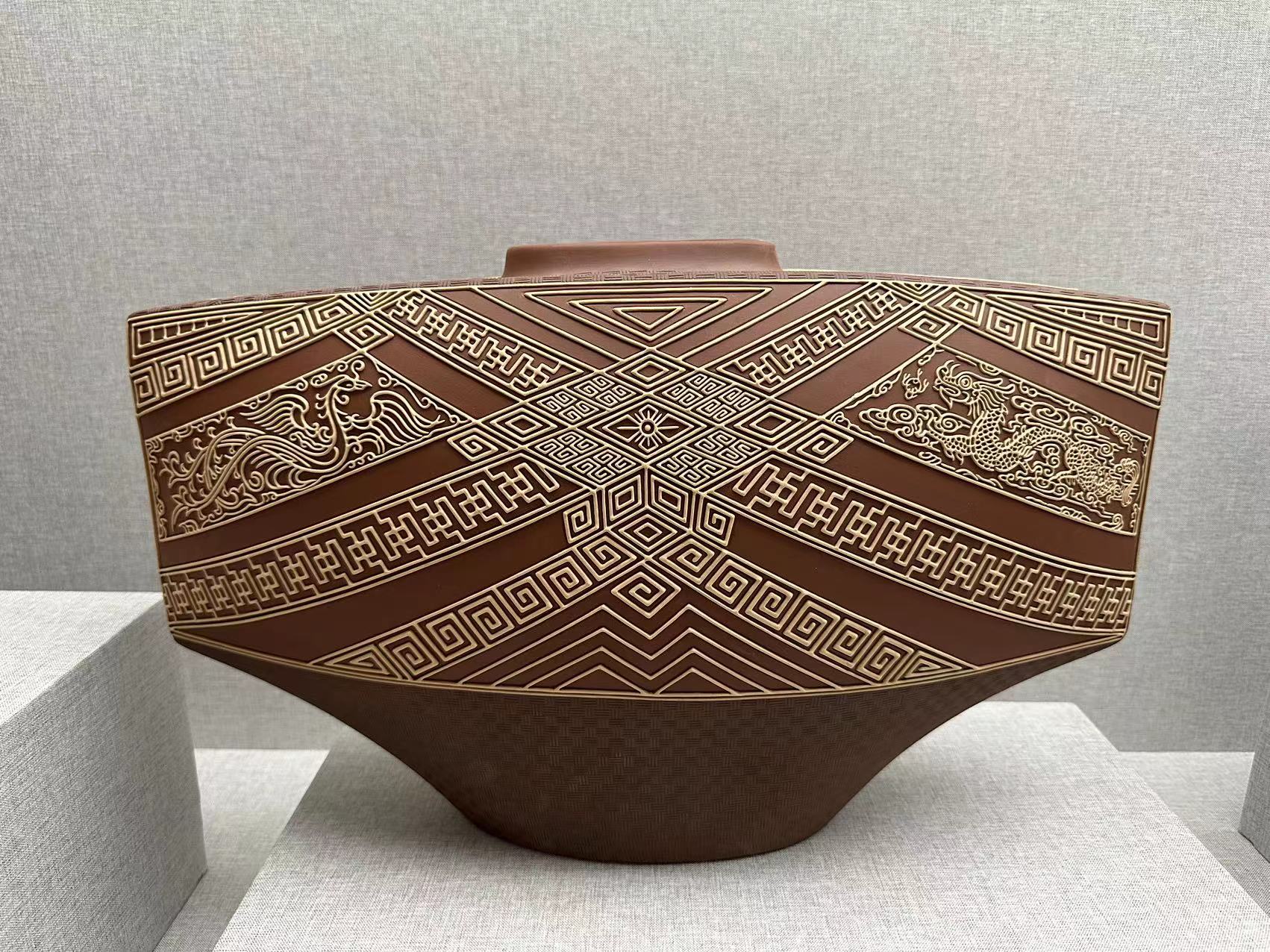 藝術就是求同存異、個性特色,在彩陶造型方面,開創(chuàng)了扁、尖、異形態(tài),在裝飾方面開創(chuàng)了挑、劃、填、噴、繪、形飾一體等十多種質感的外觀效果,作品雅俗共賞,并在四年一屆的全國陶瓷創(chuàng)新評比中十多件次獲獎,其中 “紫玉瓶”、 等作品三屆獲金獎,作品先后被“國博”“國務院”、“首博”等博物館收藏,在彩陶之余,研修紫砂壺藝,以獨特的視角創(chuàng)作作品,豐富了紫砂壺的文化藝術。