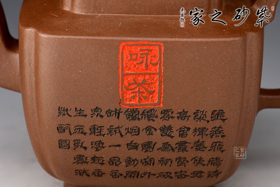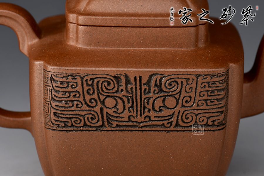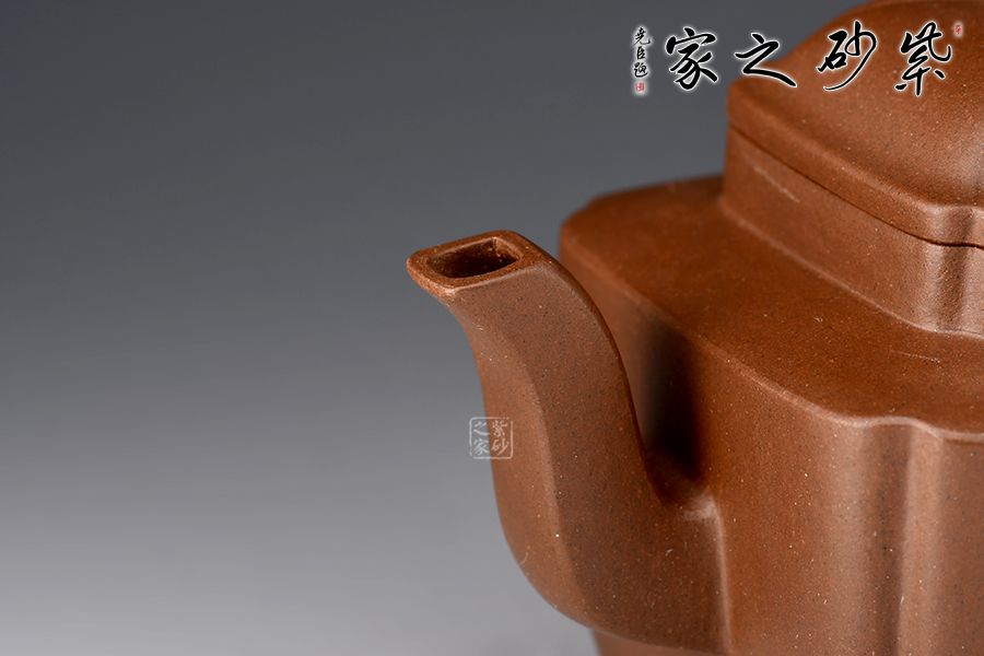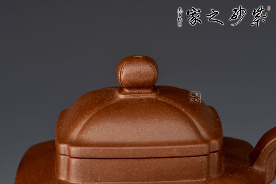 整壺在方器中融入弧線,將圓的美妙帶入方的工整,十分有趣。中豐下斂,四面鼓起,切面更加圓潤細(xì)膩。棱角抽掉,不露鋒芒,但工整的意味卻愈發(fā)突出。壓蓋設(shè)計,嚴(yán)絲合縫,蓋上的壺鈕有筋紋器的韻味。方形線條使用,給彎流壺嘴和環(huán)形把加入工整的感受。作品整體上大氣,細(xì)節(jié)處精致,工藝非常高超。