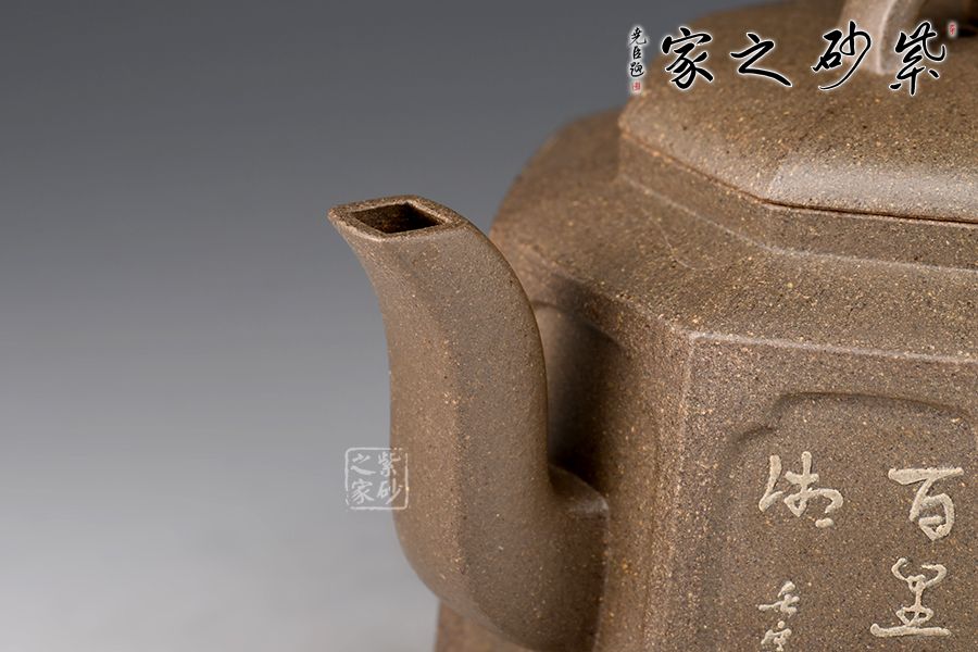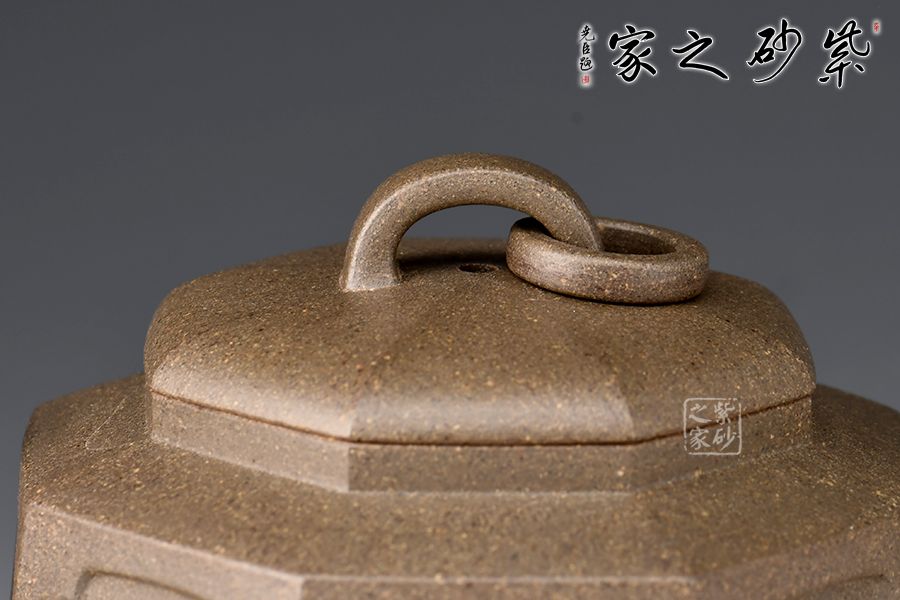 八方形體明快挺秀,具有陽剛之氣,棱角清晰,將方器的幾何之美把握得恰如其分,成型難度極高。三彎嘴,出水爽利,耳把拿捏舒適。壓蓋設(shè)計,蓋頂設(shè)有套環(huán)鈕裝飾,把玩之時輕敲其丁當(dāng)之音不絕,就好像是細聲送去祝福。